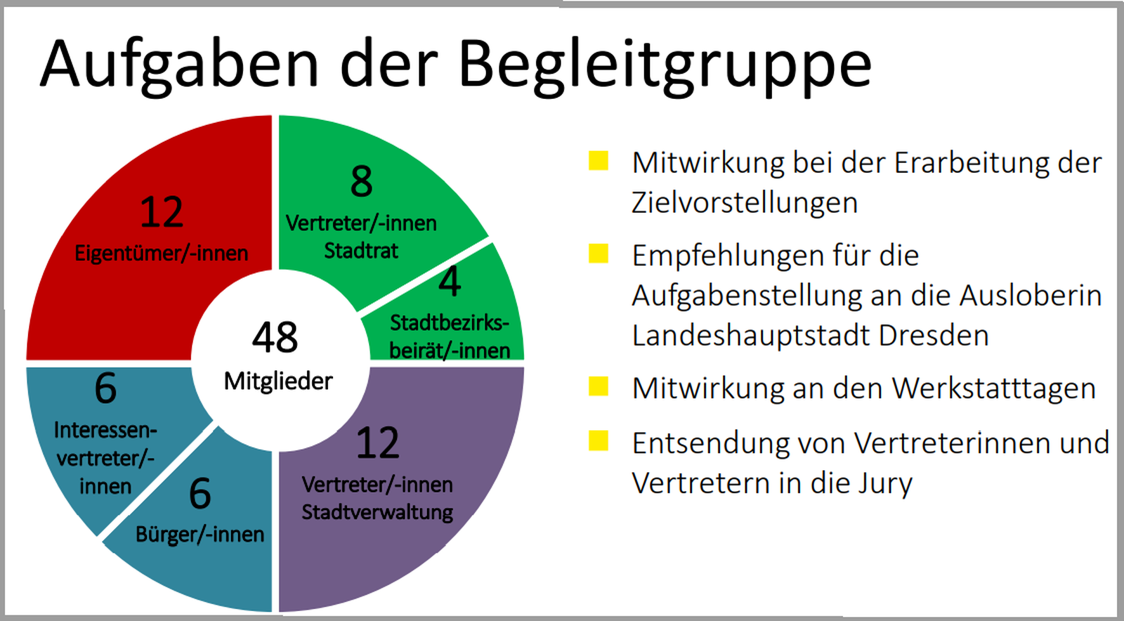 Die Stadtverwaltung will in den kommenden anderthalb Jahren eine Vorzugsvariante für die städtebauliche Zukunft des Areals am Alten Leipziger Bahnhof entwickeln. Das rund 27 Hektar große Gebiet befindet sich zwischen der Leipziger Straße, Eisenbahnstraße, Erfurter Straße und den parallel zur Großenhainer Straße verlaufenden Bahngleisen. Die 48-köpfige Begleitgruppe soll ein Kernelement der breiten Beteiligung sein