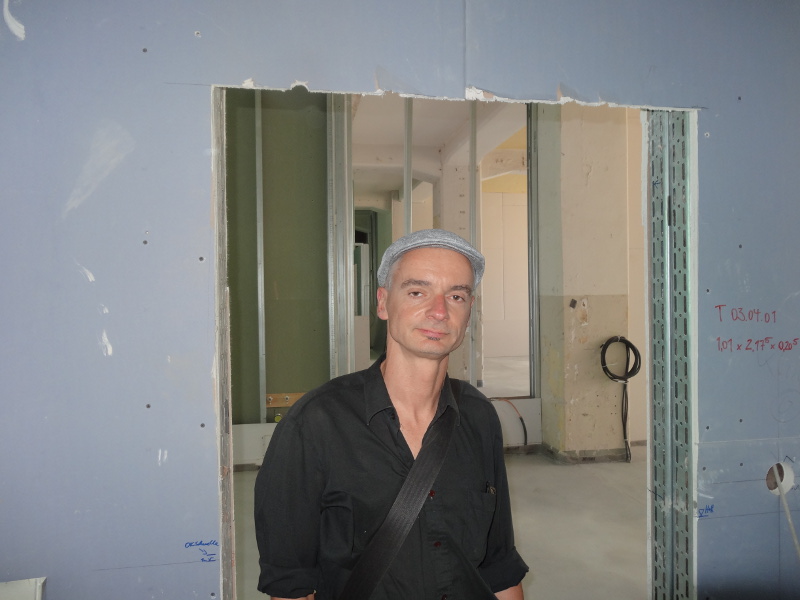 Im Gebäude B, das die beiden sechsstöckigen Türme mit ihren Ateliers verbindet, wurde in den letzten Monaten ein neues Treppenhaus eingebaut. Früher gab es nur Zugänge von den Seiten. Auf den langen Fluren im Souterrain und im Hochparterre sieht man rechts und links die neuen Trockenbauwände zwischen den alten Betonwänden. Die Räume sind hoch. Es gibt überall Fußbodenheizung.