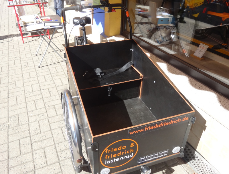 Noch bis zum 6. Oktober steht das Lastenrad Frieda bei den Fahrradexperten von Elberad in der Bürgerstraße zum Verleih bereit. Vor den Schaufenstern kann man es bewundern. Unter der Abdeckplane der schwarzen Transportkiste kommt eine kleine Sitzbank zum Vorschein, samt Sicherheitsgurt. Unter der Bank lassen sich bequem die Plane oder auch Spielzeug verstauen. Zwei Kinder haben hier Platz, meint Frank Riemer, der zusammen mit seiner Schwester Sylvia Kürth das Fahrrad-Geschäft betreibt. Vergangenes Wochenende sei eine Familie mit zwei Kindern mit dem Lastenrad unterwegs gewesen. „Die Kinder wollten gar nicht wieder aussteigen“, beschreibt Riemer den Spaß, den man offensichtlich mit dem Lastenrad haben kann.
