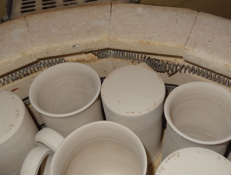 Dem Brennofen sieht man an, was er auf dem Buckel hat. Jeden zweiten Tag wird er auf 1.100 Grad erhitzt. Das dauert etwa 6 Stunden. Dann muss der Ofen zehn Minuten die Höchsttemperatur halten, damit die Glasur zerlaufen kann und die im Ofen in mehreren Schichten gestapelten Tonexponate gebrannt werden. Um den Ofen wieder herunter zu kühlen, braucht es weitere fünf Stunden. Eigentlich, so der Töpfermeister, hält das ein Brennofen fünf Jahre durch. „Mein Ofen macht es jetzt schon das siebte Jahr“, meint er. Die Elektrospiralen sind zwischendurch wegen Ermüdung schon drei mal erneuert worden, die gepressten Schamottesteine, mit denen der runde Toplader-Ofen ausgelegt ist, haben Risse und fangen an zu bröseln.