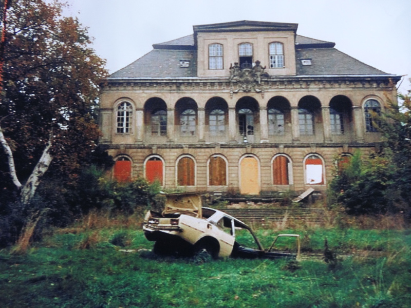 Der Verein durfte im Schloss ein Zimmer nutzen. „Auf eigene Gefahr“, so Pfeil. Hier liegen noch große Fotoreproduktionen, die das Schloss mit vernagelten Fenstern und den Brunnen davor mit der verrosteten Karosserie darin zeigen. Jetzt gehören auch Fotos von der Sommerwirtschaft zur Geschichte von Schloss Übigau. Das Kapitel ist geschlossen.
