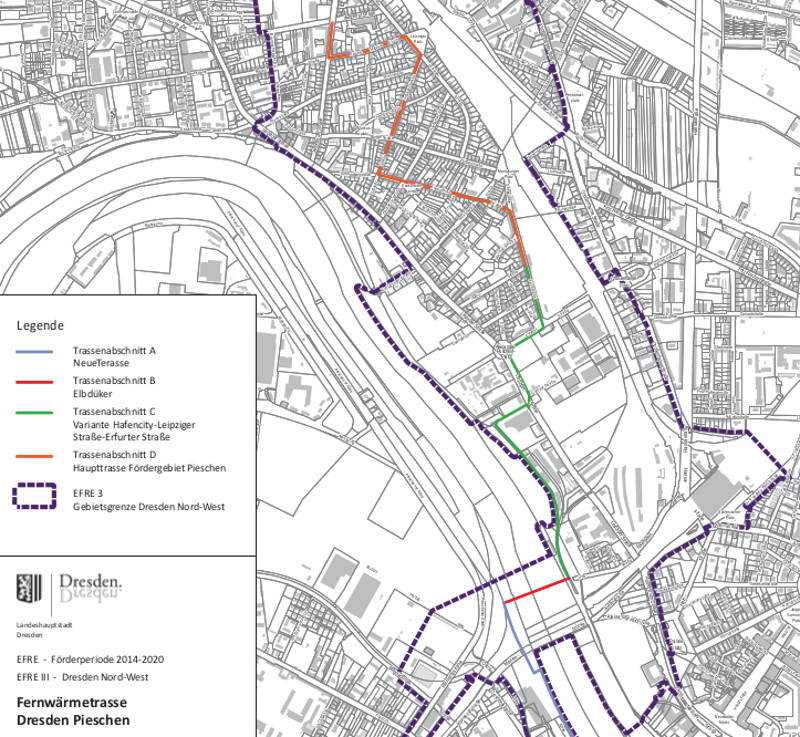 Verlauf der geplanten Fernwärmetrasse im Ortsamtsbereich Pieschen. Quelle: dresden.de