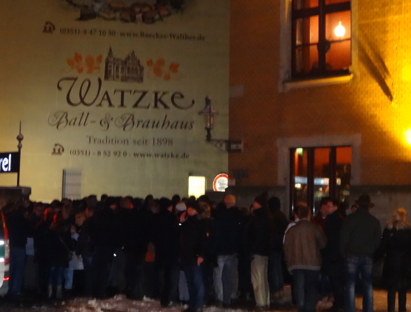 AfD- und Pegida-Anhänger warten vereint auf Einlass ins Brauhaus. Foto: W. Schenk