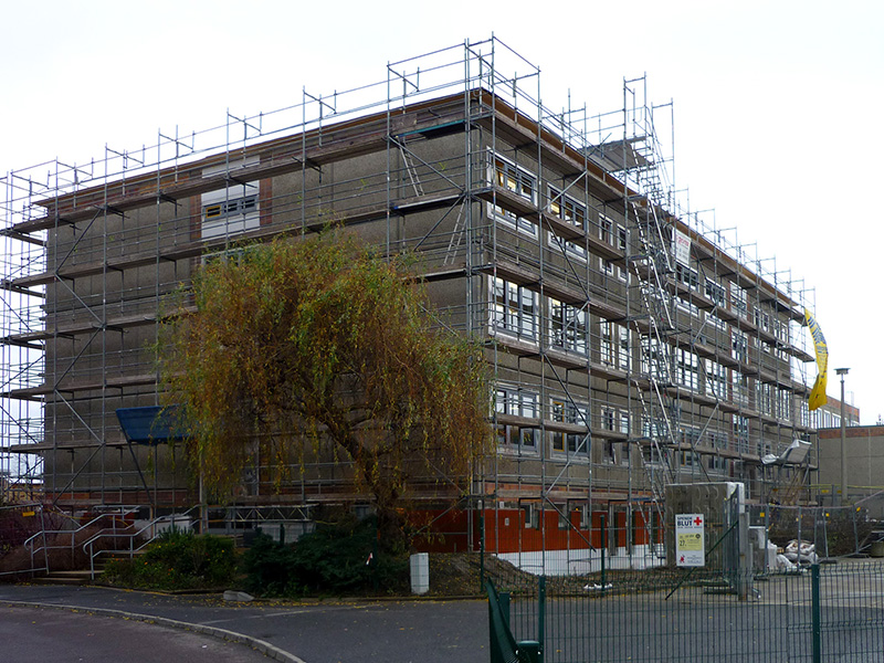 Die Monate zwischen Mai 2015 und Herbst 2016 seien allerdings „eine schwierige Zeit“ gewesen, erinnert sich Stein. Eine Sanierung bei laufendem Schulbetrieb „ist anstrengend und oft nervig. Gefühlte 1.000 Bohrungen mussten die Arbeiter setzen, um die neue Fassade vor die alte zu hängen. Das schallt durch den Beton sehr laut“, erklärt sie und sieht dennoch einen großen Vorteil: „Eine Auslagerung des Schulbetriebes an einen anderen Standort ist uns erspart geblieben“.