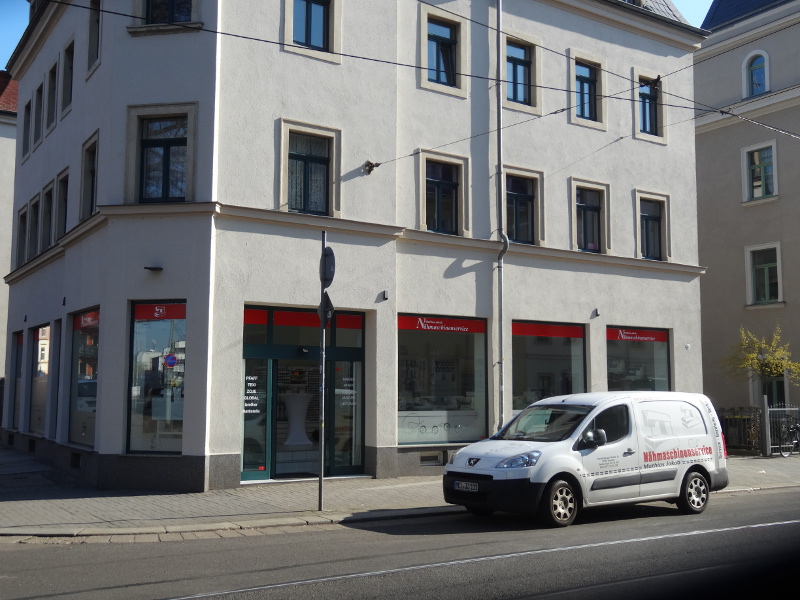 Fünf große Schaufenster und eine verglaste Eingangstür. Das Geschäft an der Ecke Bürgerstraße/Torgauer Straße ist nicht zu übersehen. Genau das wollte Mathias Jakob erreichen und ist mit seinem Nähmaschinenservice umgezogen. Heute morgen feiert er mit seinem Team und den ersten Kunden Eröffnung. Fußgänger oder Fahrgäste in der Straßenbahn können hinter dem blitzenden Glas die in zwei Reihen aufgebauten Nähmaschinen bestaunen.
