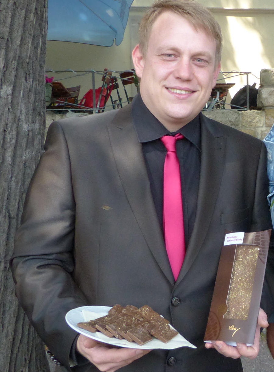 Um die Gaumen der Gäste kümmert sich Küchenchef Ronald Ay. Die Lindenbratwurst ist bereits bekannt. Jetzt hat er für die Salate ein Extra-Lindenblüten-Dressing kreiert. Das komplette Rezept will er nicht verraten, aber neben den Lindenblüten würden auch Lorbeer, Piment, Anis, Zwiebeln und einiges mehr zu einem Sud verarbeitet und dann passiert. Die Lindenblüten lassen sich aber auch in süßer Schokolade verarbeiten. Das demonstrierte heute Andreas Jung, Chef der Viba Erlebnis-Confiserie & Café in der Altmarkt-Galerie. „Wir haben mehrere Anläufe gebraucht“, erzählt er. Die richtige Mischung habe sich dann zusammen mit Orangenschalen in der Vollmilchschokolade ergeben. Bei Zartbitter und weißer Schokolade müsse man noch weiter testen. „Jedes Gewürz reagieren anders, wenn es mit Schokolade in Verbindung kommt“, erläutert Jung. Nun gibt es eine eigene Lindenblüten-Schokolade, die ausschließlich in der Lindenschänke verkauft werden, fügt er hinzu.