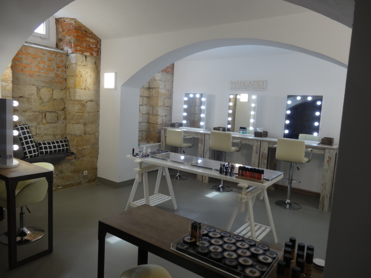In dem großen Gewölbekeller hat Anja ihr wichtigstes Standbein, die Makeup-Schule, eingerichtet. Diese hatte sie 2016 gegründet. Weil die Nachfrage schnell wuchs und der Platz in dem Studio in der Mohnstraße langsam knapp wurde, suchte das Paar nach neuen Räumen. „Wir haben unsere Fläche mehr als verdreifacht“, rechnet Daniel Mangatter vor. Zu einem Schmuckstück haben die beiden den Keller ausgebaut. Die Sandsteinwände wurden gründlich gereinigt, der alte Mief ist nirgends mehr vorhanden. Drei Arbeitsplätze befinden sich nebeneinander an der Stirnwand des Gewölbes. Ein vierter entsteht separat an einer Seitenwand. „Wir brauchen einen extra Platz, damit wir mit Linkshändern ausweichen können“, erläutert Daniel den Grund.