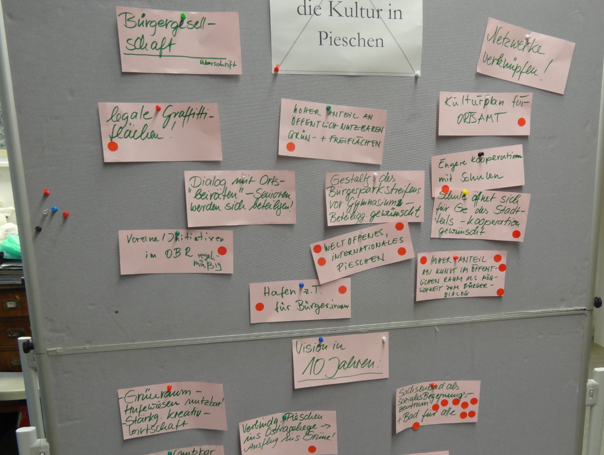 Alle Teilnehmer des Pieschener Bürgerforums brachten sich auf ihre Art und Weise in den Diskurs zur Stadtteilkultur ein, spätestens mit dem Abstimmen für die aus eigener Sicht wichtigsten Visionen innerhalb der Gruppen oder bei der anschließenden „Brezel mit Getränken“. Um nun die Ergebnisse der Diskussion zu präzisieren, präsentierten die Vertreter der einzelnen Diskussionsrunden die Wünsche, die am meisten Aufmerksamkeit gefunden hatten. Neben den bereits genannten Visionen um das Sachsenbad und das Wohnquartier am alten Leipziger Bahnhof, äußerten die Teilnehmer unter anderem den Wunsch nach einem offenen Bürgerhaus, einer Mietpreisregelung, die der sozialen Durchmischung des Stadtteils zugutekommen soll sowie einem Veranstaltungskalender für den Ortsamtsbereich. Ein öffentlicher Zugang zum Pieschener Hafen und eine Zukunft für das Schloss Übigau gehörten ebenfalls zu den Visionen. Mehr Ausstrahlung in den Stadtteil wünschten sie die Bürger von den Künstlern im Zentralwerk, der Geh8 sowie vom Stadtteilhaus Emmers.