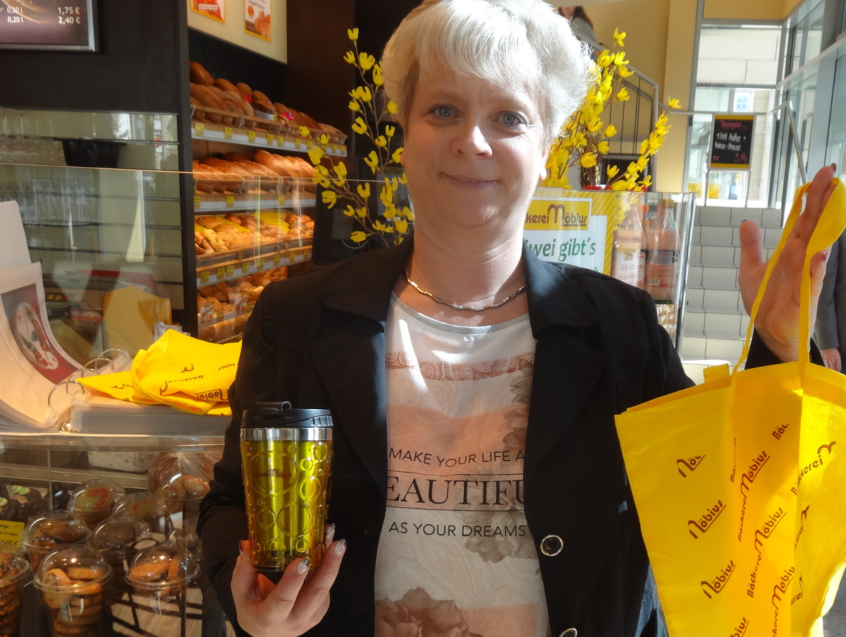 „Unser Ziel ist es, dass sich Mehrwegbeecher genauso durchsetzen wie Mehrwegtaschen anstelle des Plastebeutels“, erklärte Jähnigen. Bei Möbius-Verkaufsleiterin Antje Göbel stößt sie damit auf offene Ohren. „Wir bieten bereits seit fast zwanzig Jahren unsere Brötchenbeutel aus Baumwolle an, sagte sie. Die Nachfrage steige kontinuierlich. Bis zu 2000 Beutel würden pro Jahr verkauft. Nun wolle man schnell die 15 Dresdner Möbius-Filialen, darunter auch die in der Leipziger Straße, mit den Aufklebern ausstatten, versprach sie. Geschäftsführer Möbius fügte hinzu: „Erfolg hat das nur, wenn der Kunde seinen Teil dazu beiträgt“.