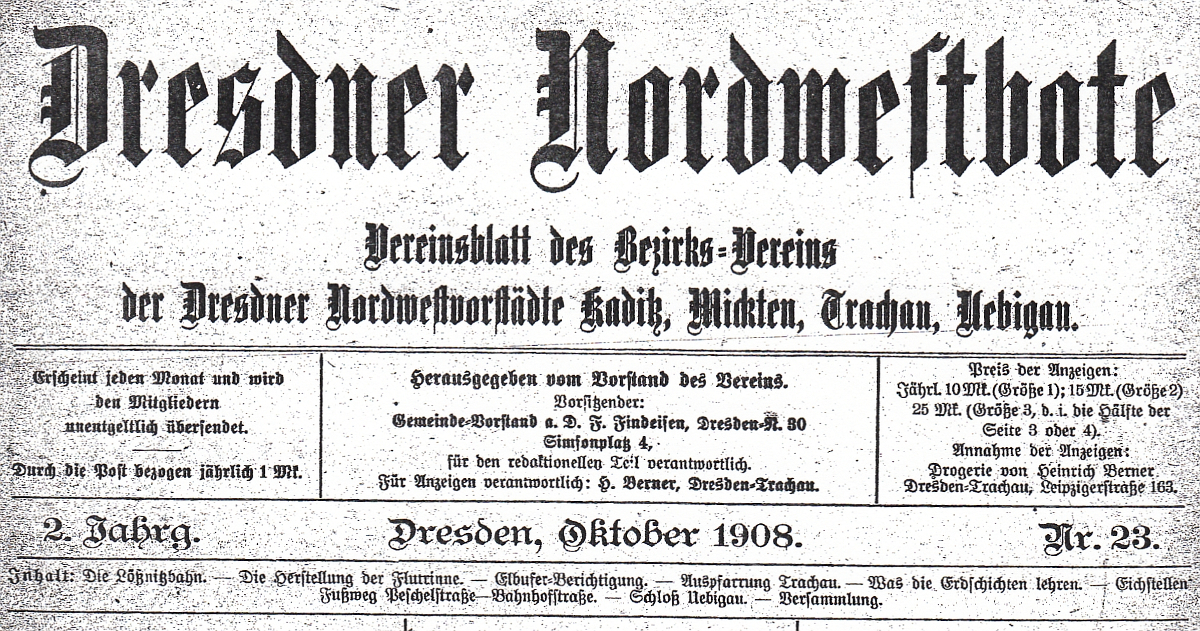 Der „Dresdner Nordwestbote“ vom Oktober 1908 druckte unter der Titelzeile „Auspfarrung Trachau“ folgende im „Dresdner Anzeiger“ vom 17. Sept. 1908 veröffentliche Bekanntmachung ab: „Hierdurch wird zur öffentlichen Kenntnis gebracht, daß die Vorstadt Trachau mit Genehmigung des Evangelisch-lutherischen Landeskonsistoriums mit dem 1. Oktober 1908 aus der Emmausparochie zu Dresden-Kaditz ausgepfarrt wird und von da eine selbständige Kirchgemeinde Dresden-Trachau mit eigenem Pfarramt bildet.“