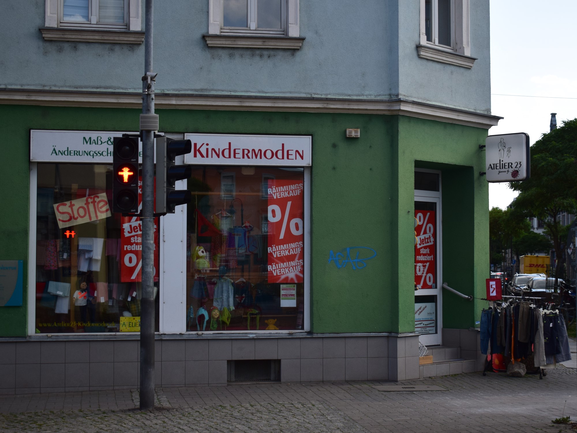 Was mir hier zuerst aufgefallen ist, sind die zahlreichen Näh- und Stoffläden. Es sind hier wirklich sehr viele. Wenn man die Bürgerstraße oder die Oschatzer Straße entlang geht, findet man allein schon fünf. Das Geschäft, das ich als erstes gesehen habe, war „Atelier 23“. Es hat am 21. Juni geschlossen. Jetzt wird hier bereits renoviert. Denn der Nachmieter steht schon fest. Das Nähkabinett aus der Oschatzer Straße 12 wird hierher umziehen.
