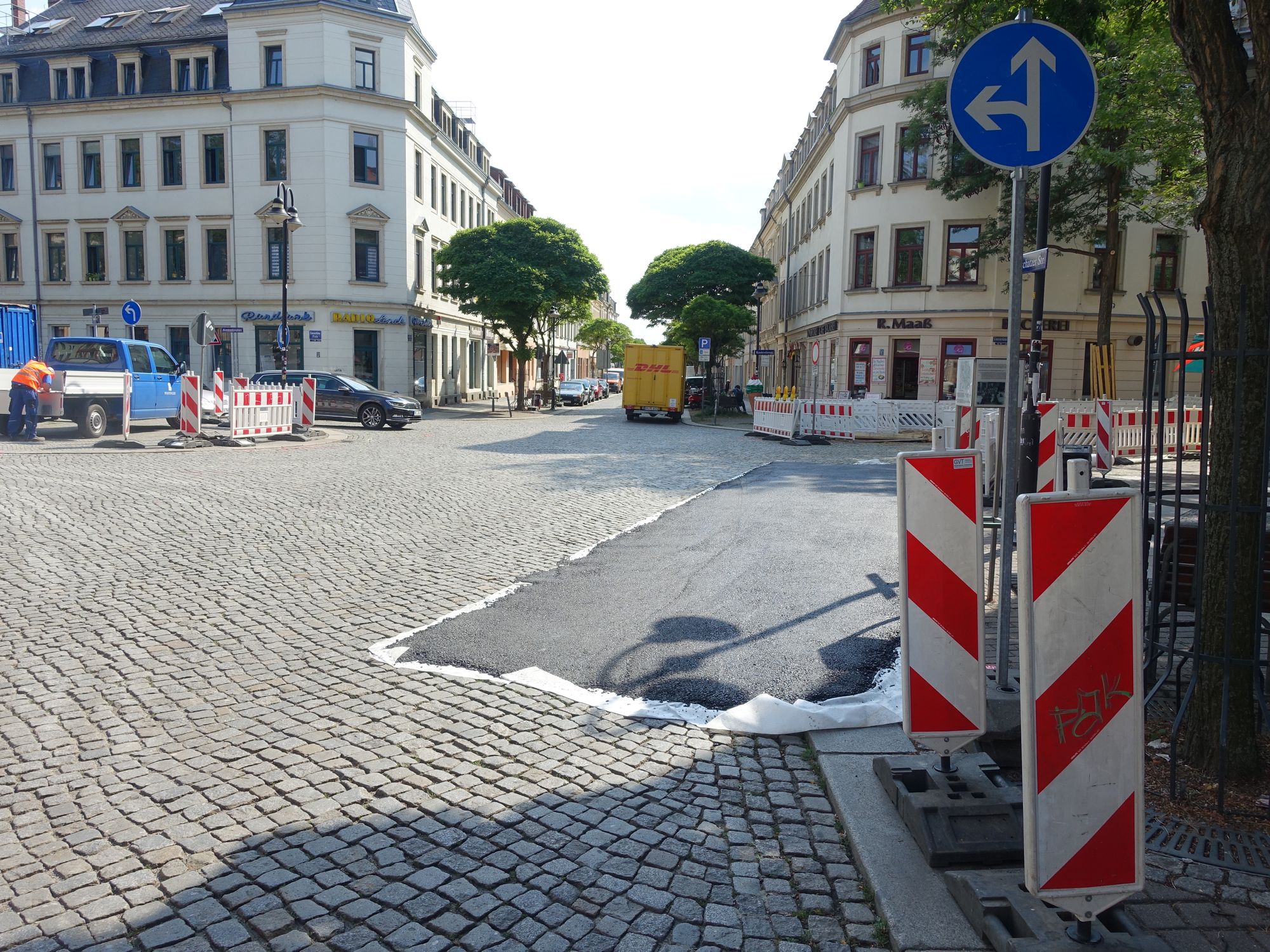 Die Ausweichfahrbahn ist auf der Westseite der Oschatzer Straße bereits asphaltiert worden. Die andere Hälfte der Fahrbahn wird aufgebaggert, um an die in der Konkordienstraße bereits verlegten Rohre anschließen zu können. Danach wird dann die andere Seite der Oschatzer Straße gesperrt, um die Arbeiten fortsetzen zu können.