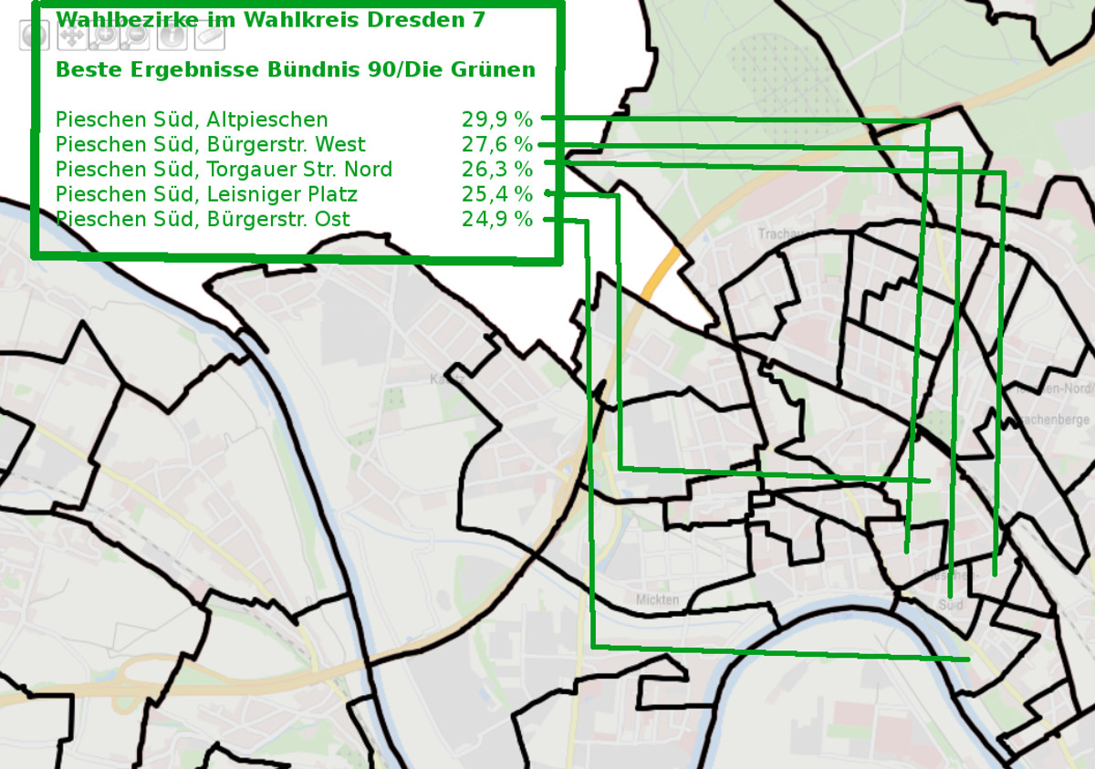 Im Stadtbezirk Pieschen zeigen die Wahlergebnisse klare politische Präferenzen. Die meisten Stimmen in den Wahlbezirken erzielten entweder die AfD, die CDU oder die Grünen. Während die AfD vor allem in Übigau, Mickten und Trachau Süd dominiert, erzielt die CDU in Kaditz, Trachau und Trachenberge ihre besten Ergebnisse. Die Grünen dominieren in Pieschen Süd und Stadt Neudorf. Überraschend landete die Die Linke in keinem der Wahlbezirke auf dem ersten Platz.