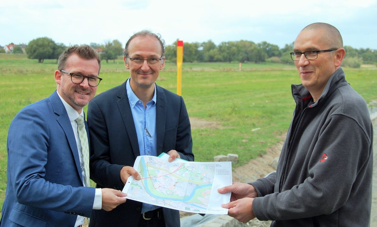 Noch baut die Stadt am Kaditzer Elberadweg. Ende November soll die Eröffnung stattfinden (Pieschen Aktuell berichtete). Doch nun verkündet Robert Franke stolz: „Wir können schon Anfang November, vielleicht schon Ende Oktober, diesen Abschnitt des Elberadwegs für alle Radfahrer öffnen.“ Franke ist kommissarischer Leiter des Straßen- und Tiefbauamts. Mit Gerd Jarosch, Verkehrsingenieur beim Amt, und Verkehrsbürgermeister Raoul Schmidt-Lamontain (Grüne) traf er sich am vergangenen Mittwoch zum Ortstermin auf der Baustelle. Anlass war die Europäische Mobilitätswoche.