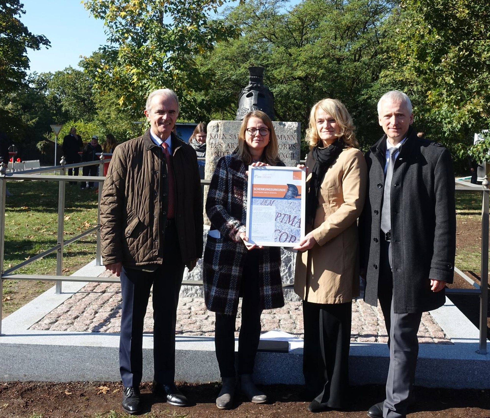 Für Kulturbürgermeisterin Annekatrin Klepsch (Die Linke) ist die Restaurierung des Denkmals – es ist eines von rund 9.500 in der Stadt – ein „wunderbares Beispiel dafür, wie durch gemeinsame Initiative etwas Sinnstiftendes und Bleibendes geschaffen werden kann“. Marcus von Oppen übergab ihr dann die Urkunde, die die Schenkung des Denkmals an die Stadt besiegelt. Dem hatte der Stadtrat auf seiner Sitzung im Juni 2019 zugestimmt.