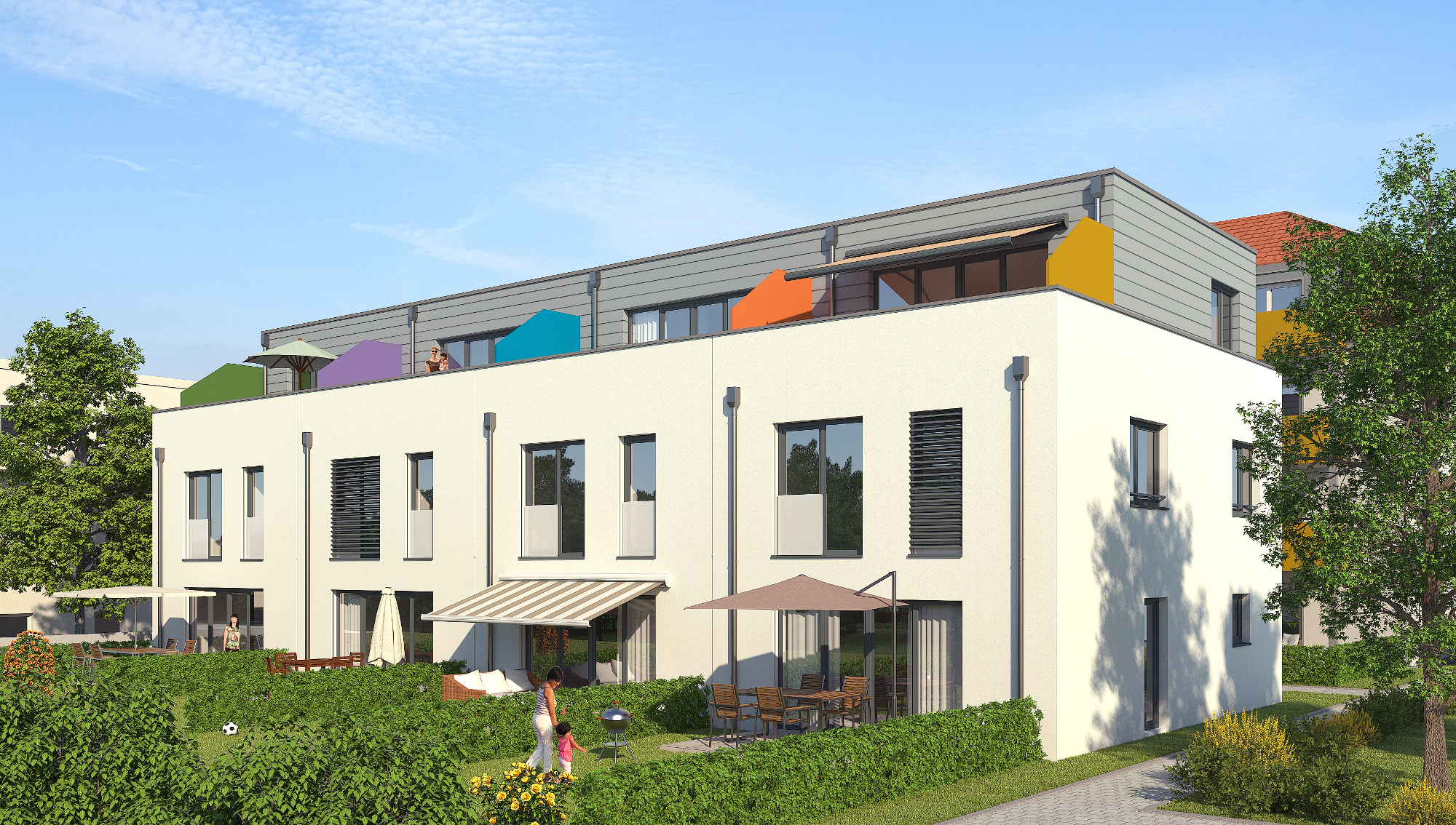 Die vier Reihenhäuser stehen in zweiter Reihe und haben kleine Gärten. Quelle: Treubau Dresden