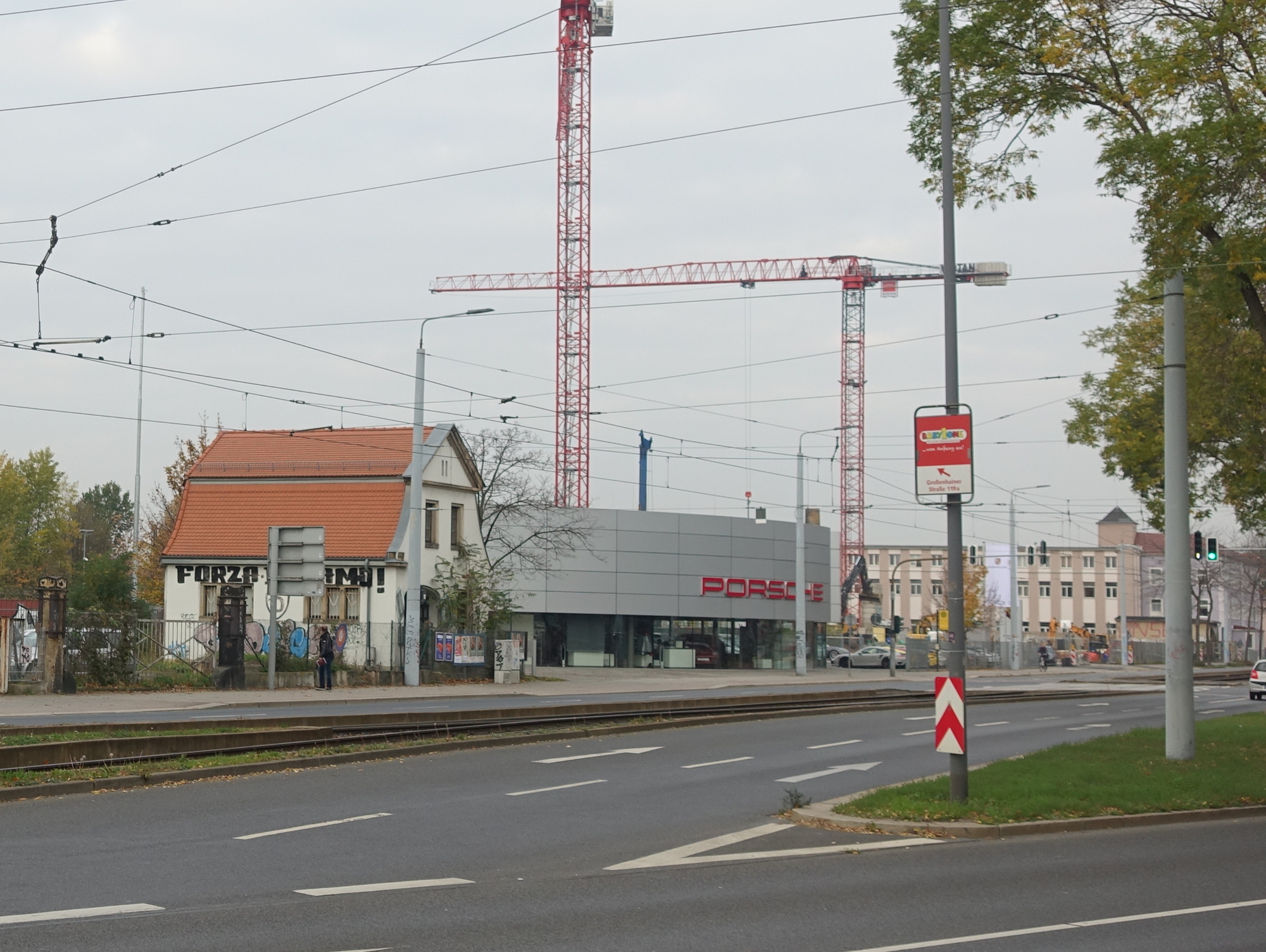 Das Porsche Zentrum Dresden wird seinen Standort von der Großenhainer Straße in die Meinholdstraße verlegen. Auf dem Grundstück gegenüber der Druckerei Prinovis Dresden verkündet ein Bauschild die Entstehung eines neuen und größeren Autohauses. Einen genauen Umzugstermin nennt das Unternehmen noch nicht. Sicher ist dagegen bereits, was am jetzigen Standort des Autohauses an der Großenhainer Straße 3 geplant ist. Und zwar bis Ende 2022.