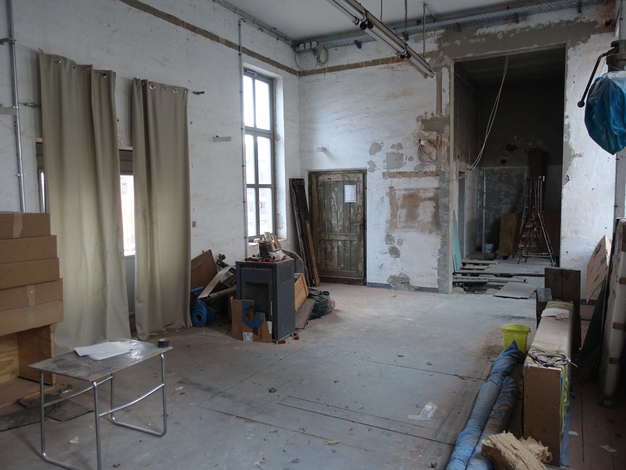 Während der Campus inzwischen seinen Baustellencharme abgelegt hat, wird noch intensiv auf dem Außengelände der GEH8 und dem Grünzug Gehestraße, der sich zwischen dem Campus und der Gehestraße erstreckt, gearbeitet. „Wir sind eine Baustelle“, sagt GEH8-Vereinsvorsitzender Paul Elsner. „Jetzt können alle sehen, was das hier für eine Rumpelbude ist. Jahrelang konnten wir hier nichts machen“, fügt er hinzu und will eigentlich nicht von den ganzen Querelen mit Bahn und Stadtverwaltung und dem Zuständigkeitsvakuum reden. Erst im Sommer 2018 gab es Fördermittel für die Instandsetzung. Es wurden neue Fenster eingebaut, die Elektroanlage saniert und das Dach repariert. „Mehr als zehn Jahre haben wir hier mit Dachpappe die undichten Stellen geflickt“, erinnert sich Elsner und könnte noch viele andere in Eigenleistung erbrachte Instandhaltungsarbeiten auflisten. Noch immer ohne Heizung ist die große Ausstellungshalle.