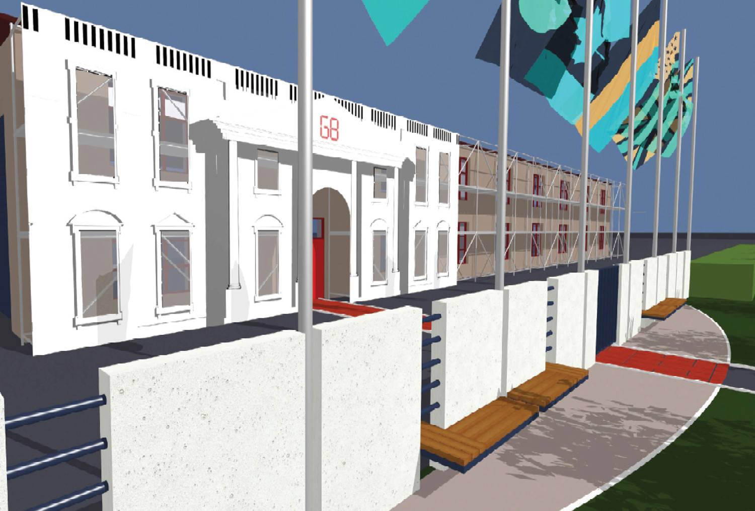 Grenzte die Rückseite des GEH8-Areals früher an eine nicht begehbare Brache, ist sie durch den Campus-Neubau in völlig neues Licht gerückt. Der Verein will diesen Bereich darum künstlerisch und baulich neu gestalten und aufwerten. „Künstlerisch haben wir uns für eine Flaggeninstallation des Berliner Künstlers Saeed Foroghie entschieden“, erklärt Paul Elsner. Die Kunstkommission der Stadt hatte das Projekt befürwortet und eine Förderung von 30.000 Euro zugesagt. Die Fahnenmasten stehen bereits, die acht Flaggen flattern im Wind. Der Name GEH8 rührt von der Hausnummer – die Installation GEH? schaffe eine andere Verbindung, in die Politik, sagt Elsner. Kleine Motoren an den Fahnenmasten sorgen dafür, dass nie alle acht Fahnen ob sind. Warum auch? Warum bestimmen acht Mächte, nicht drei oder fünf, über wichtige politische Entscheidungen? Darum, so Elsner, passe die Installation bestens zum Kunstraum.