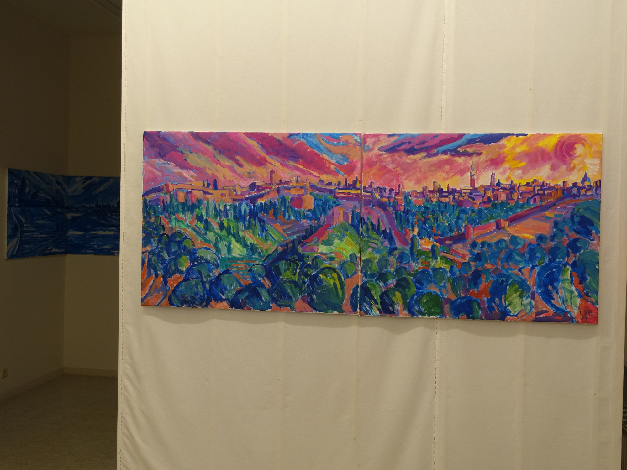 Gräfe malt im Freien ohne Staffelei. Er legt die Leinwand auf die Erde. „Auf diese Art zu arbeiten verlangt eine gewisse Übung, weil sich die Perspektive ändert, wenn man nach unten schaut“, erklärt Gräfe. Wenn er in der Toscana, in Marokko oder Ägypten male, könne er nicht mit einer Staffelei reisen. Das wäre viel zu aufwändig. Eine besondere Vorliebe hat der Maler für zweiteilige Bilder. Dann werden zwei nebeneinander auf der Erde liegende Leinwände bearbeitet. Für die Ausstellung habe er ein Diptychon von Sienna ausgewählt.