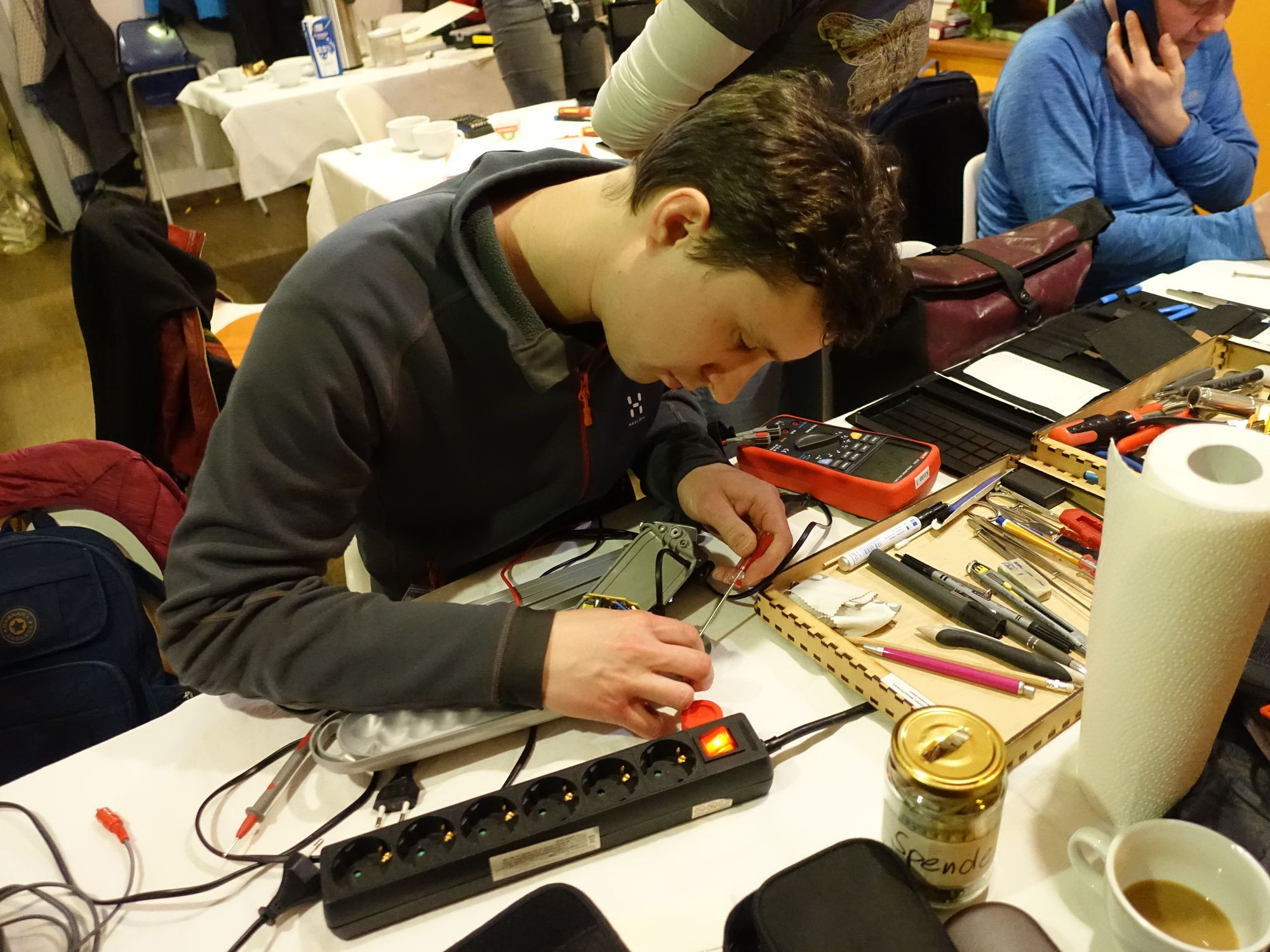 Zum Februartermin brachten die Besucher außer der Festplatte und dem Smartphone noch einen Plattenspieler, einen Kaffeeautomaten, eine Schreibtischlampe, einen Samsung-TV, einen Drucker, einen Smoothie-Maker und einen Bluetooth-Lautsprecher mit. Bei letzterem kam jede Hilfe zu spät – Totalschaden. Sonst verlief der Abend erfolgreich. Johannes zog später in seinem Repaircafé-Protokoll Bilanz und konstatierte: 12,3 Kilogramm Schrott vermieden. Gewissenhaft werden so die Reparatur-Abende an den sechs Standorten des Repaircafés – in Freital und fünf mal in Dresden – festgehalten.