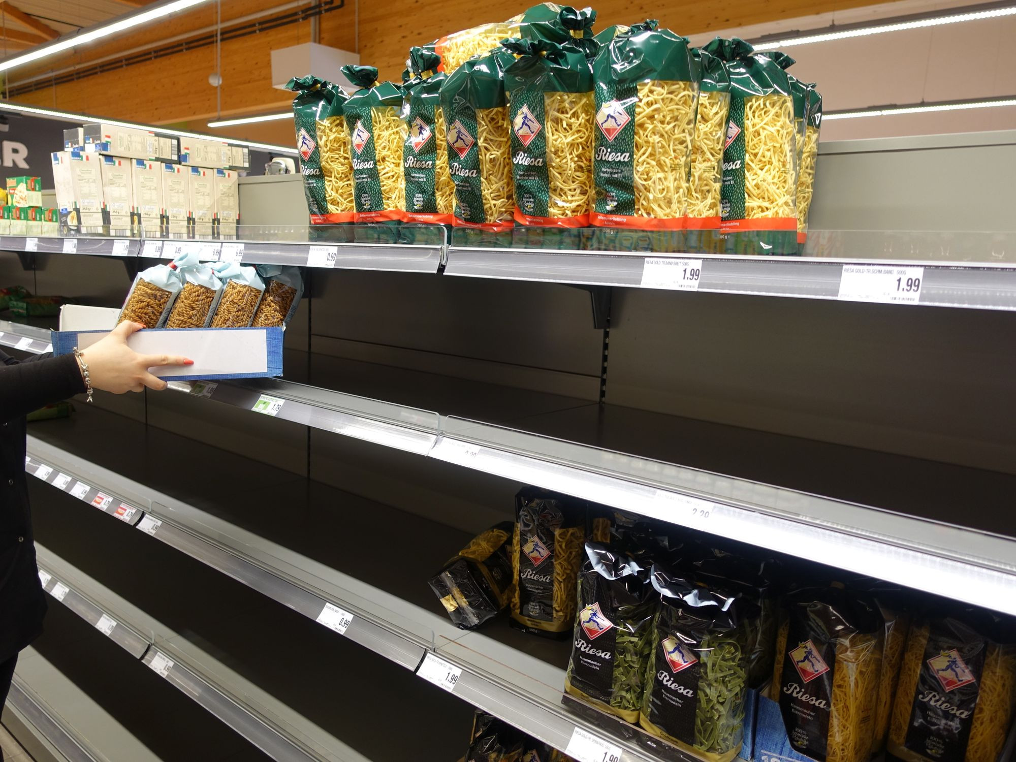Die Logistik werde immer schwieriger, weil die Nachfrage so drastisch gestiegen sei. „Wir haben zwei Tage Verzug und bekommen am Freitag die Waren, die schon am Mittwoch da sein sollten“, beschreibt sie die Lage. Lieferfahrzeuge stünden an den Grenzen, die meist polnischen Fahrer seien plötzlich nicht mehr verfügbar. Nicht nur bei Toilettenpapier und Teigwaren, sondern auch bei Reis, Zucker, Mehl, Konserven oder Müsli müssten die Regale unverhältnismäßig oft nachgefüllt werden. Das gelte auch für die Tiefkühltruhen, wo Pizza, Fisch, Gemüse und Fertiggerichte in Mengen weggingen. Nur bei Süßigkeiten halte sich die Nachfrage trotz der vielen Osterware in Grenzen.