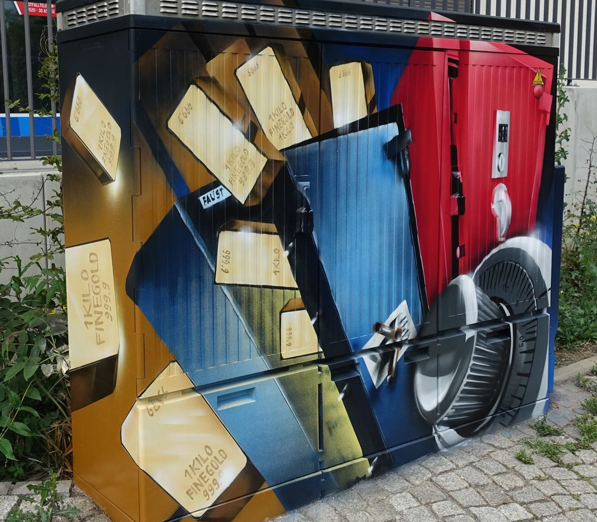 „Wir wollten das ändern, haben uns schlau gemacht und dann mit der Telekom eine Einigung erzielt“, sagt er. „Keine politischen Botschaften“ – das sei Voraussetzung gewesen für die Genehmigung, den Verteilerkasten zu gestalten. Nachdem die Telekom-Vertreter den Entwurf gesehen hatten, war der Weg frei für Slider, auf dem Verteilerkasten seiner Phantasie rings um das Thema Tresore freien Lauf zu lassen. „Mit gefällt es. Das sieht doch schick aus“, so das Urteil von Johannes Faust.