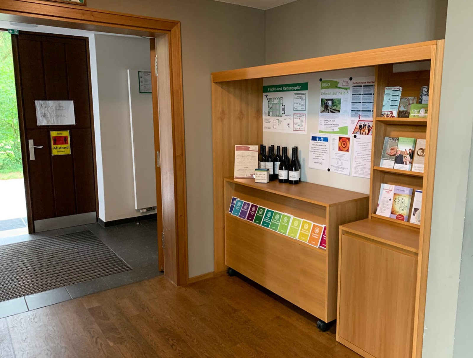 Wenn die Konzert- und Kinobesucher die Kirche betreten, werden sie weitere Neuerungen sehen. Seit Anfang Juni zeigt sich der Eingangsbereich in die Kirche mit neuem Gesicht. Zwei maßgefertigte Möbelstücke bieten jetzt an der einen Seite Platz für eine Garderobe und eine Ablage für die Gesangsbücher und an der anderen Seite für einen Rolltresen und eine Plakatwand. Die Gesamtkosten von rund 6.100 Euro sind mit einem Anteil von 3.500 Euro aus dem Verfügungsfonds des Stadtbezirksbeirates finanziert worden. Das hatten die Beiräte auf ihrer Januarsitzung befürwortet. Wir haben für die Arbeiten drei Angebote eingeholt und uns dann für das wirtschaftlichste entschieden, sagte Florian Reißmann, Vorstand der Laurentiuskirchgemeinde, die den Umbau in Kooperation mit dem Verein KulturKirche Weinberg Dresden-Trachenberge realisiert hat.