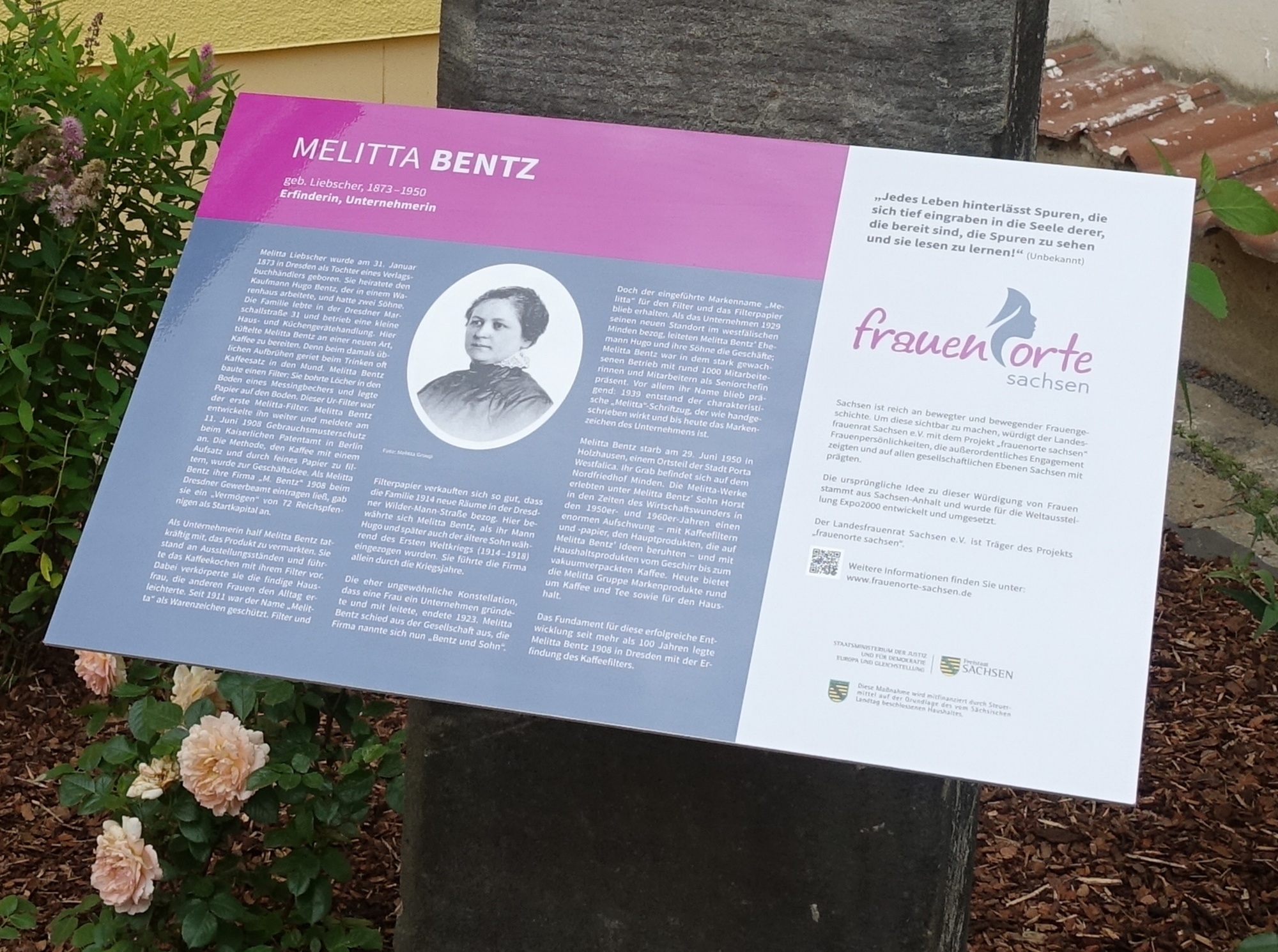 Über das Ergebnis ihres Engagements können sich die drei beteiligten Parteien nun freuen. In einer bepflanzten Ecke vor dem Haus „Wilma 13“ bildet die alte sanierte Steinsäule den passenden Hintergrund für die Gedenktafel für „Melitta Bentz, geb. Liebscher, 1873 bis 1850. Erfinderung und Unternehmerin“.