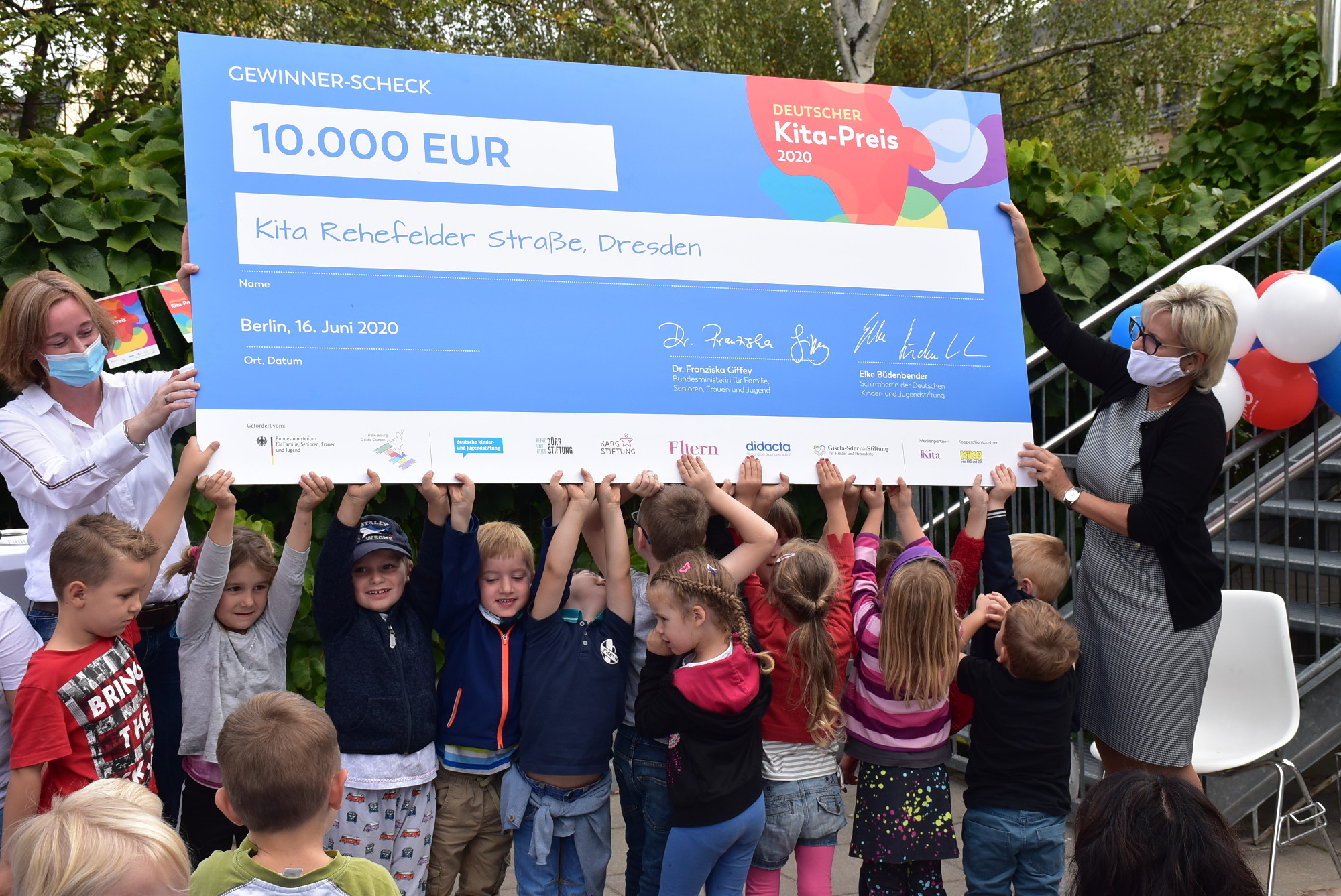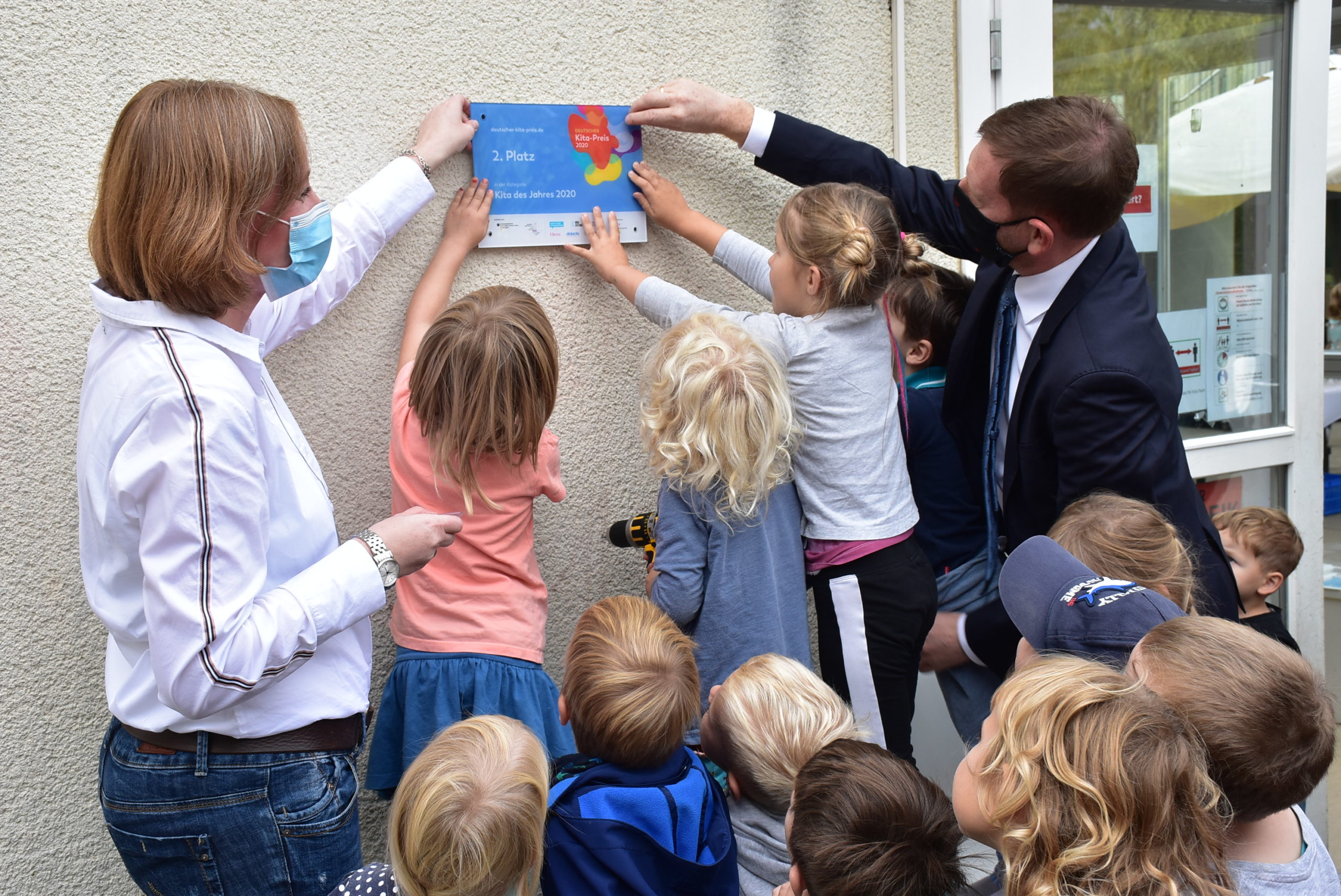 Ministerpräsident Kretschmer überreichte Kita-Leiterin Katja Hillenbrand eine Plakette, die er im Anschluss gemeinsam mit ihr und einigen Kindern an der Wand anbrachte. Bildungsbürgermeister Donhauser übergab Sabrina Simank, stellvertretende Vorsitzende des Fördervereins der Kita Rehefelder Straße, die Urkunde zum 2. Platz des Deutschen Kita-Preises. Ministerin Klepsch übergab den Scheck in Höhe von 10.000 Euro. Am Ende erhielt jedes Kindergartenkind eine Medaille.