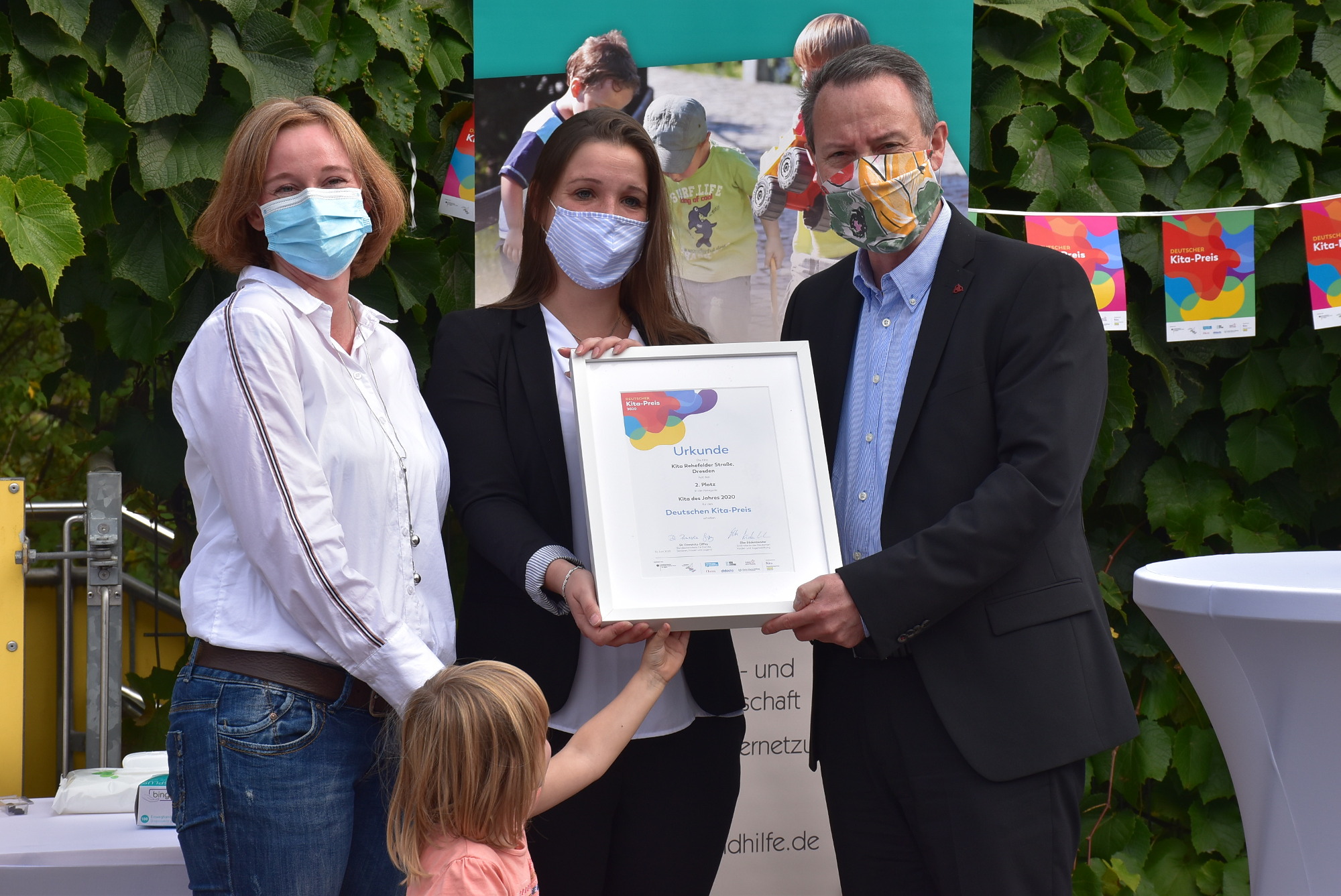 Großer Bahnhof am vergangenen Mittwoch in der Kita Rehefelder Straße. Nach der Preisverkündung auf der digitalen Award-Show im Juni folgte nun die offizielle Übergabe von Urkunde, Plakette und des 10.000-Euro-Schecks für den zweiten Platz beim Deutschen Kita-Preis 2020. Ministerpräsident Michael Kretschmer, Kultur- und Tourisimusministerin Barbara Klepsch (beide CDU), die in Pieschen ihren Wahlkreis hat und Dresdens Bildungsbürgermeister Jan Donhauser (CDU) besuchten die Kita, die sich unter 1.500 Bewerbern um den Preis „Kita des Jahres“ durchgesetzt hatte und nur der Pinguin Kita aus Aurich in Ostfriesland den Vortritt gelassen hatte.