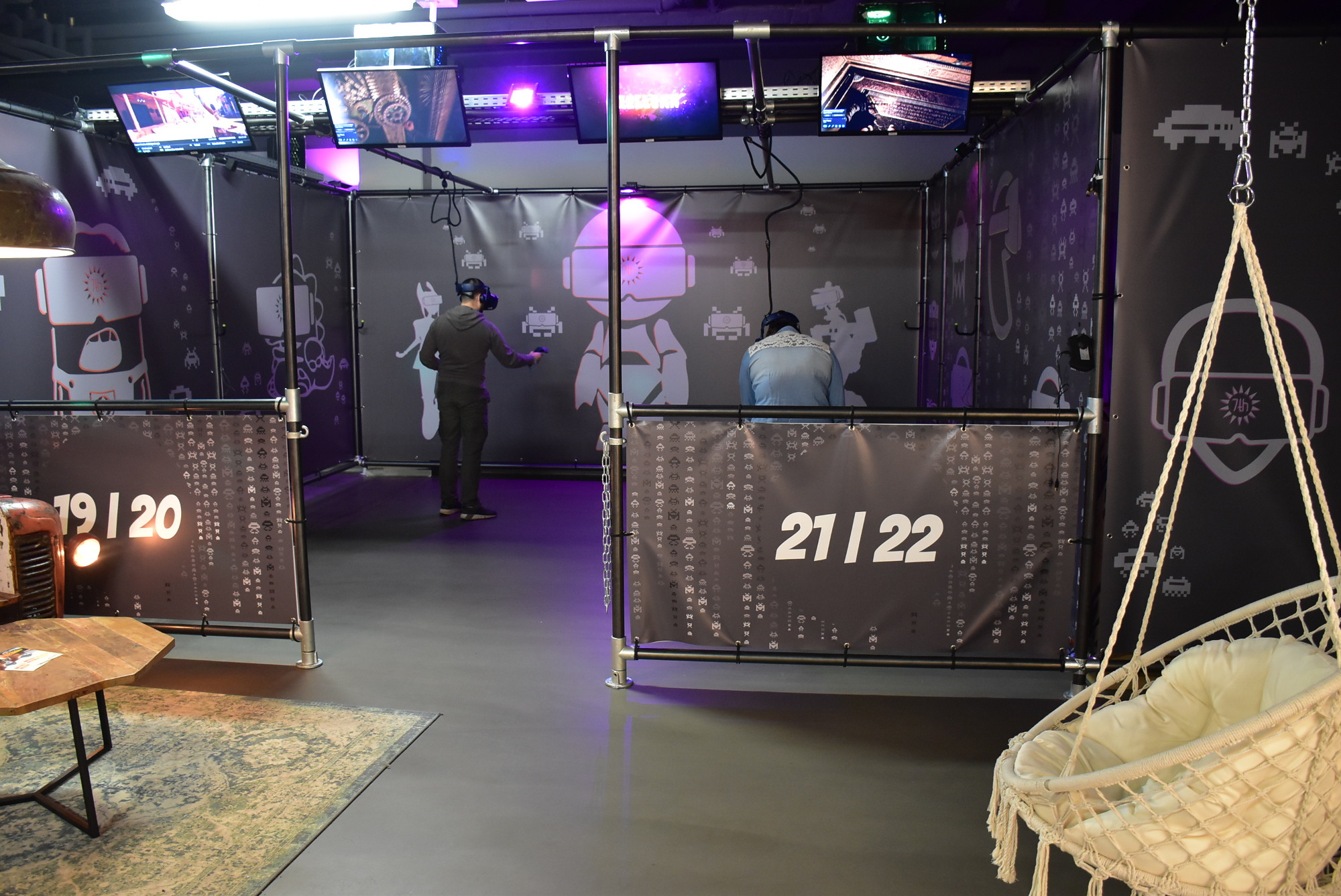 „Während die Leute sonst nur irgendwo in der Ecke sitzen und mit Playstation oder Smartphone spielen, bewegen sie sich bei uns, sind koordinativ ganz anders gefordert und erleben die Welten, in die sie sich begeben mit weiteren Sinnen“, beschreibt Laura die Herausforderung. Sie gehört zu den fünf Festangestellen im 7th-Space-Team. Auf ihren Bildschirmen am Tresen können sie mitverfolgen, welche Spiele die Kunden gerade spielen, wo sie sich genau befinden und bei Bedarf auch helfen, wenn die Besucher an einer Stelle nicht weiterkommen.