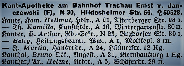 Im Dresdner Adressbuch 1936, dessen Druck im Dezember 1935 abgeschlossen wurde, sind für die Stadtteile Pieschen und Trachau unter dem Abschnitt „Berufsklassen und Gewerbebetriebe“ nachgenannte Apotheken aufgelistet: „Hirsch-Apotheke“, „Moltke-Apotheke“ und „Elisabeth-Apotheke“, allesamt Leipziger Straße, sowie „Barbara-Apotheke“ und „Weinberg-Apotheke“, beide Großenhainer Straße. Wie jede dieser Apotheken eine eigene Geschichte hat, so kann auch die im Laufe des Jahres 1936 in Trachau eröffnete „Kant-Apotheke“ auf eine solche verweisen. Den Beleg dafür finden wir im Adressbuch von 1937.