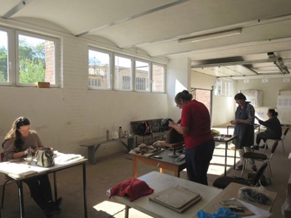 „Die Künstlerinnen durften in einer Lagerhalle vor Ort mit dem Material experimentieren. Das gemeinsame Arbeiten bringt viele Anregungen, da jede Schaffende anders mit dem Rohstoff umgeht und diverse Inhalte bearbeitet. Es wird geschnitten und montiert, gewalzt und geschlagen, geknetet und in Gipsformen gepresst, partiell mit Oxyden, Engoben, Glasur, Glas und Metalleinlagen gestaltet“, erklärt Karin Heyne. Danach werden die Werke von den Mitarbeitern sorgfältig getrocknet und im 60 Meter langen Tunnelofen gemeinsam mit den Produktionschargen gebrannt.