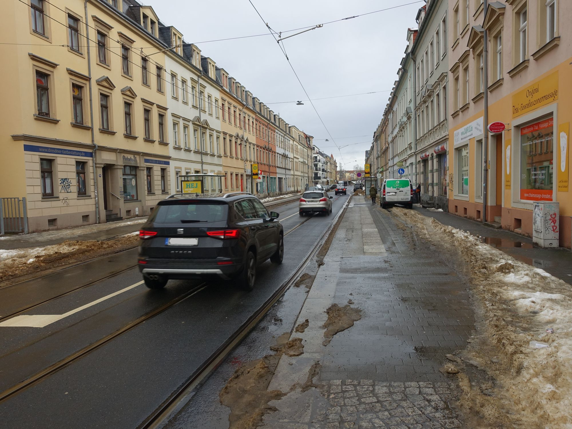 1. Früher oder später wird es sowieso zu Umbaumaßnahmen auf der Straße kommen in deren Ergebnis die Parkplätze rechts und links im fotografierten Bereich zum Opfer fallen. Der mittlere Gleisabstand ist für die neuen Stadtbahnwagen zu eng. Wenn man früh oder abends die vielen Ein- und Ausrücker sieht scheinen die DVB hier Handlungsbedarf zu haben. Ist wohl eine Hauptstrecke zum Ein- und Ausrücken für die Linien 4 und 9. Das heißt, Gleisabstand verbreitern, damit ist der Abstand zwischen Bahn und parkenden Autos nicht mehr gewährleistet. Die Parkplätze fallen weg. Jetzt wird ein gefahrloses Radfahren möglich und alle derzeitigen Debatten dazu werden gegenstandslos. Mal von den Falschparkern im Kreuzungsbereich abgesehen. Nur bis jetzt weiß niemand wann die Baumaßnahme kommt.