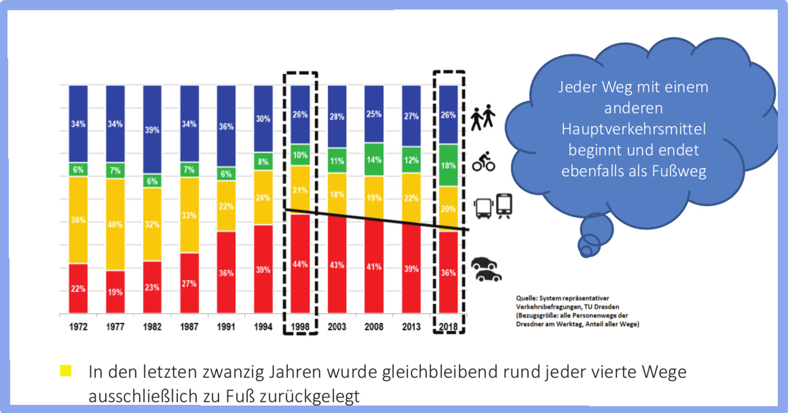 Ein Viertel ihrer Wege legen die Dresdnerinnen und Dresdner zu Fuß zurück. Daran hat sich in den vergangenen zwanzig Jahren nichts geändert, zeigen die regelmäßigen Erhebungen der Verkehrsexperten der TU Dresden. Auch die Nutzung des Nahverkehrs ist mit 20 Prozent anteilig gleich geblieben. Verschoben haben sich innerhalb des sogenannten Modal Splits nur die Anteile des Verkehrs mit dem Auto und mit dem Rad. Während der Radverkehr von 10 auf 18 Prozent anstieg, sank der des Autoverkehrs von 44 auf 36 Prozent.