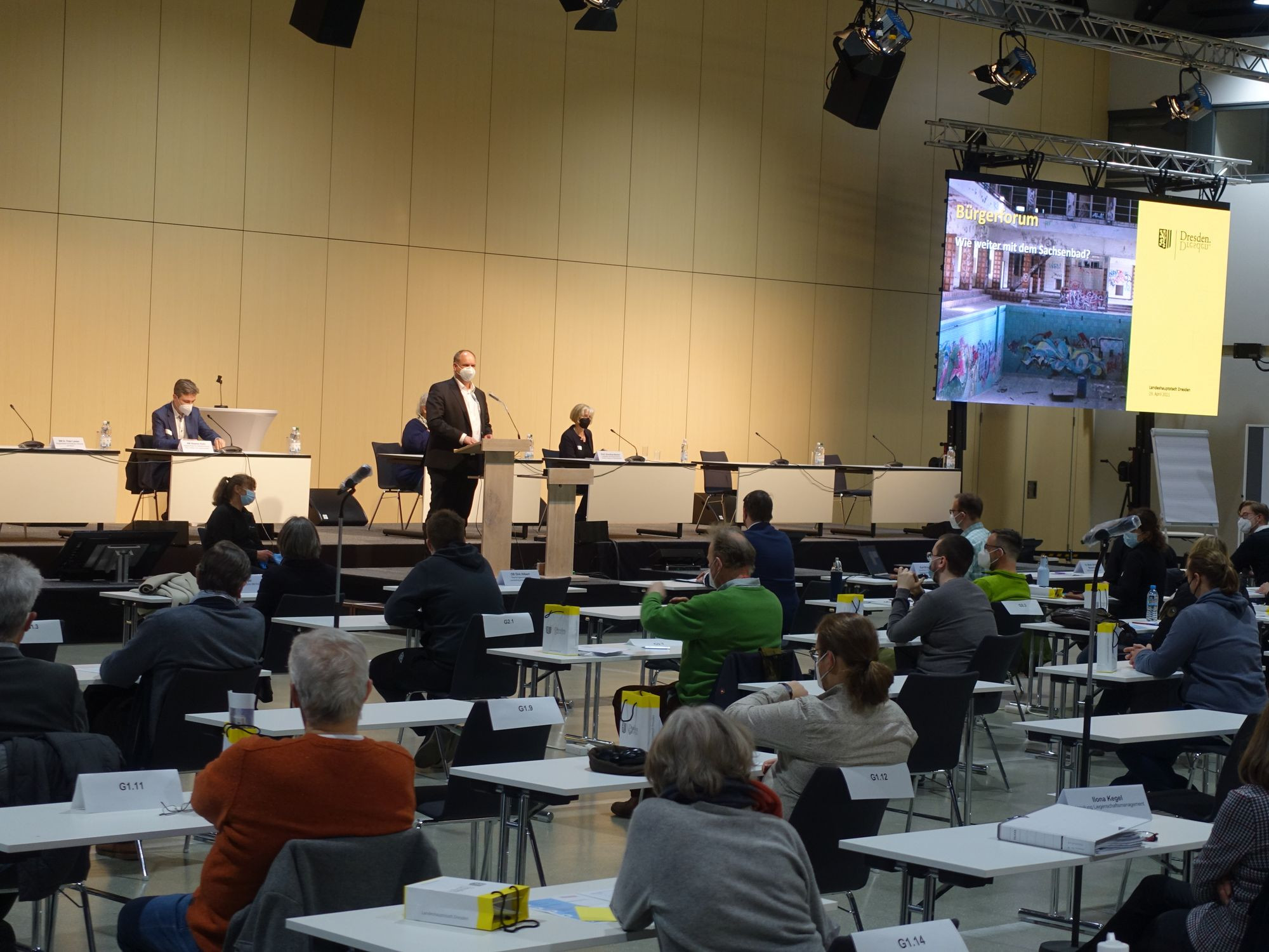 Pünktlich um 18 Uhr hatte Oberbürgermeister Dirk Hilbert das erste Bürgerforum der Stadt eröffnet. Zuvor hatten alle, die keinen tagesaktuellen Corona-Test vorweisen konnten, die Möglichkeit, sich gleich vor Ort testen zu lassen. „Es ist nicht hoch genug einzuschätzen, wenn sich Bürger für die Belange ihrer Stadt engagieren“, sagte Hilbert und verwies darauf, dass es erst die vor zwei Jahren vom Stadtrat verabschiedete Bürgerbeteiligungssatzung möglich gemacht hatte, ein solches Forum durchzuführen. „Ich hoffe, dass die Premiere Lust macht auf weitere Bürgerforen“, schloss er seine Begrüßungsworte.