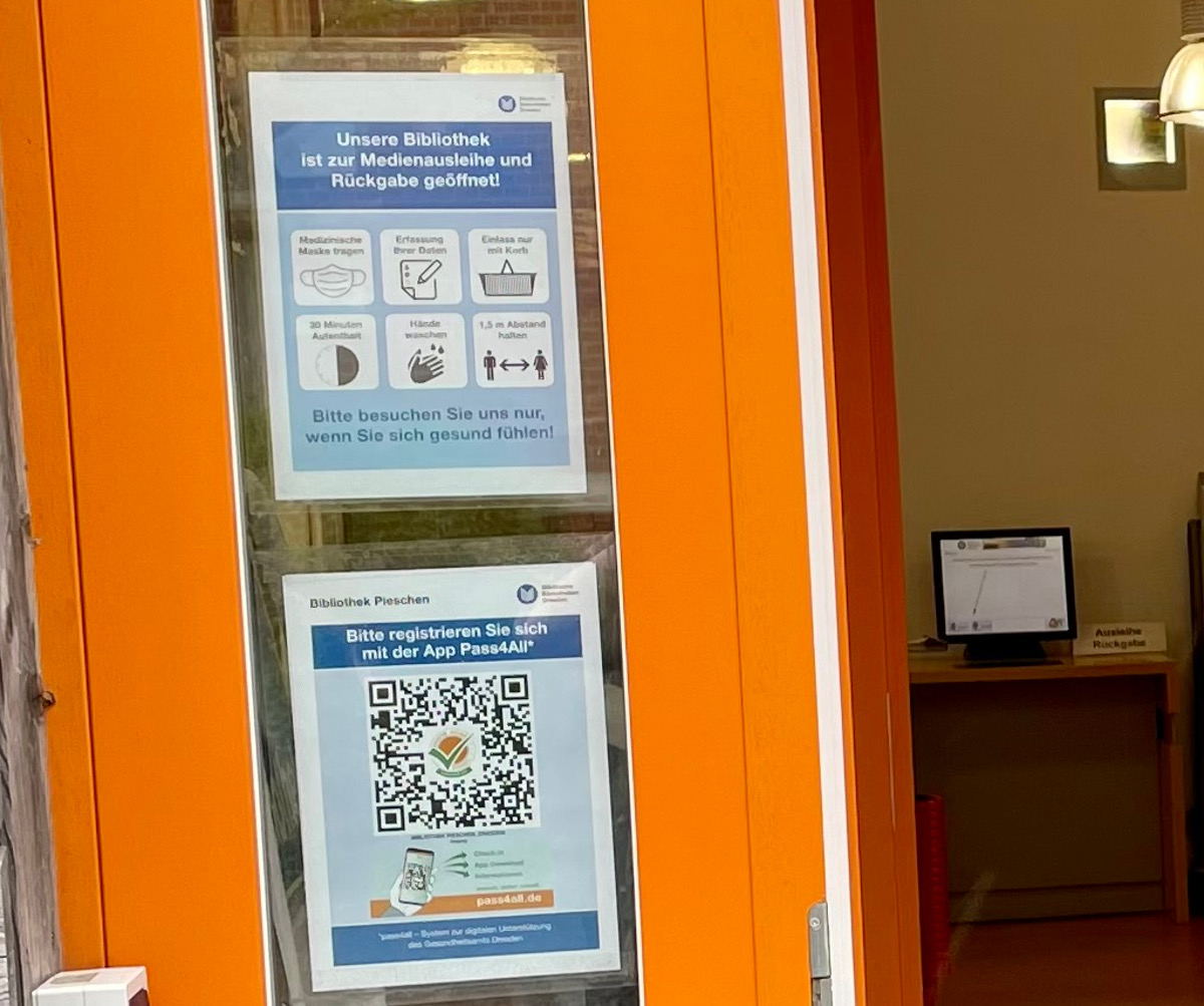 Seit gestern können Nutzerinnen und Nutzer der Stadtteilbibliothek Pieschen die Nachverfolgungsapp Pass4all zum einchecken und auschecken nutzen. Beim Betreten muss nun nur noch der QR-Code am Einlass mit der App gescannt werden, beim Verlassen das entsprechende Symbol in der App zum Auschecken genutzt werden. Damit entfällt das lästige Zettelausfüllen bei jedem Besuch. Dennoch muss sich die Anwendung offenbar erst herumsprechen. „Die meisten Besucher füllen noch die Kontaktformulare aus“, meinte Bibliothekarin Paula Latta. Die App muss auf dem Smartphone heruntergeladen und aktiviert werden. Die Anwendung der App sei einfach, auf der Facebook-Seite der Städtischen Bibliothek gebe es ein kurzes Erklärvideo dazu.