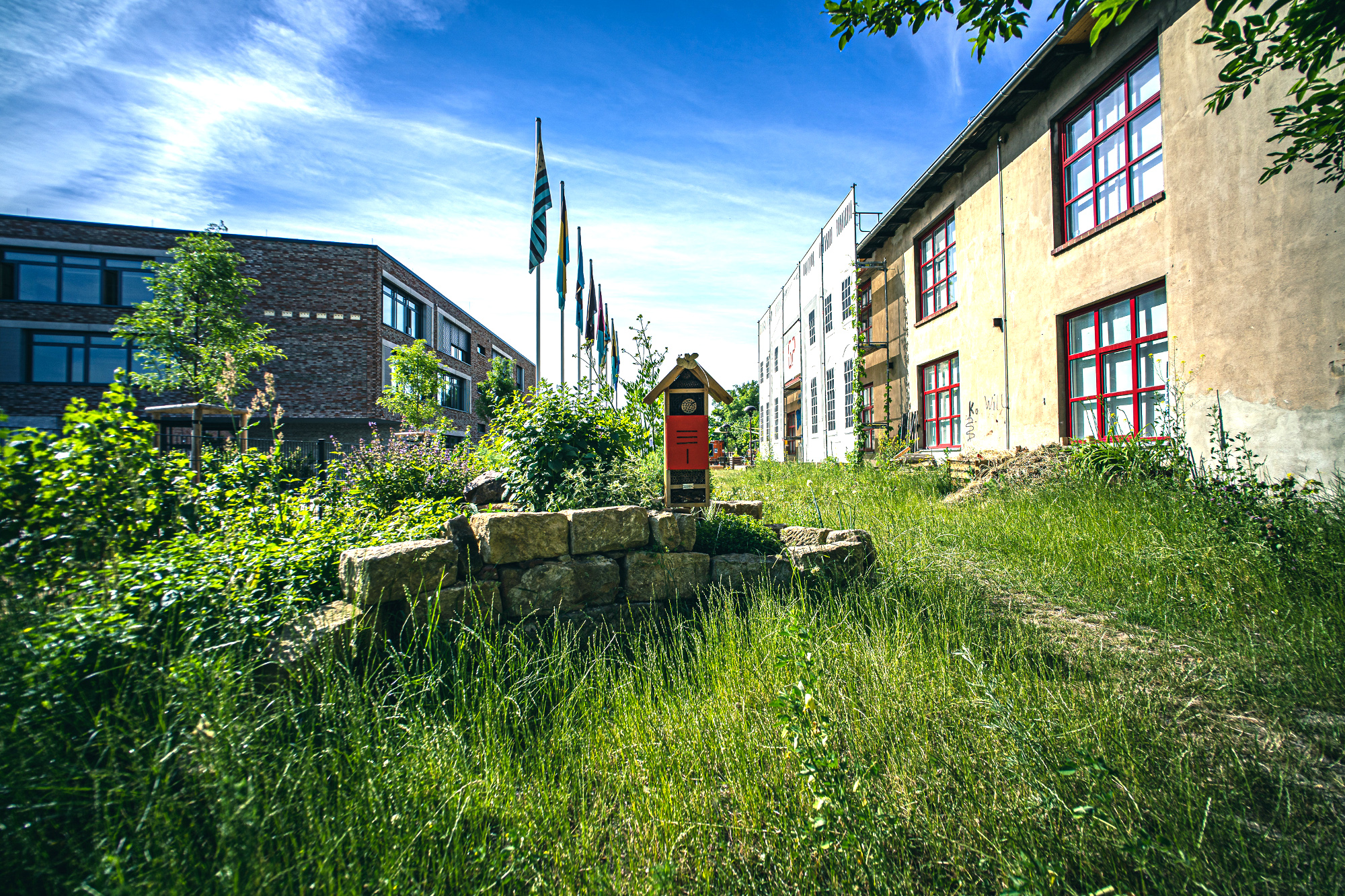 Die Fläche der Geh8 hat viel zu bieten, und das nicht nur innerhalb der vier Wände des Atelier- und Kunstraums. Auch draußen gibt es einiges zu entdecken. Der seit etwa einem Jahr bestehende Sommergarten lädt zum gemütlichen Verweilen ein, überall blüht und grünt es. Dazu kommt nun ein weiteres Projekt. An der Fassade der Rückseite wird in diesem Herbst ein Insektenhotel entstehen. Wobei Rückseite fast schon irreführend ist. Seit der Fertigstellung des Fuß- und Radweges zwischen dem Schulcampus und dem Grünzug Gehesstraße, in dem sich auch das Vereinsgebäude befindet, hat sich der ehemalige Hinterhof stark gewandelt.