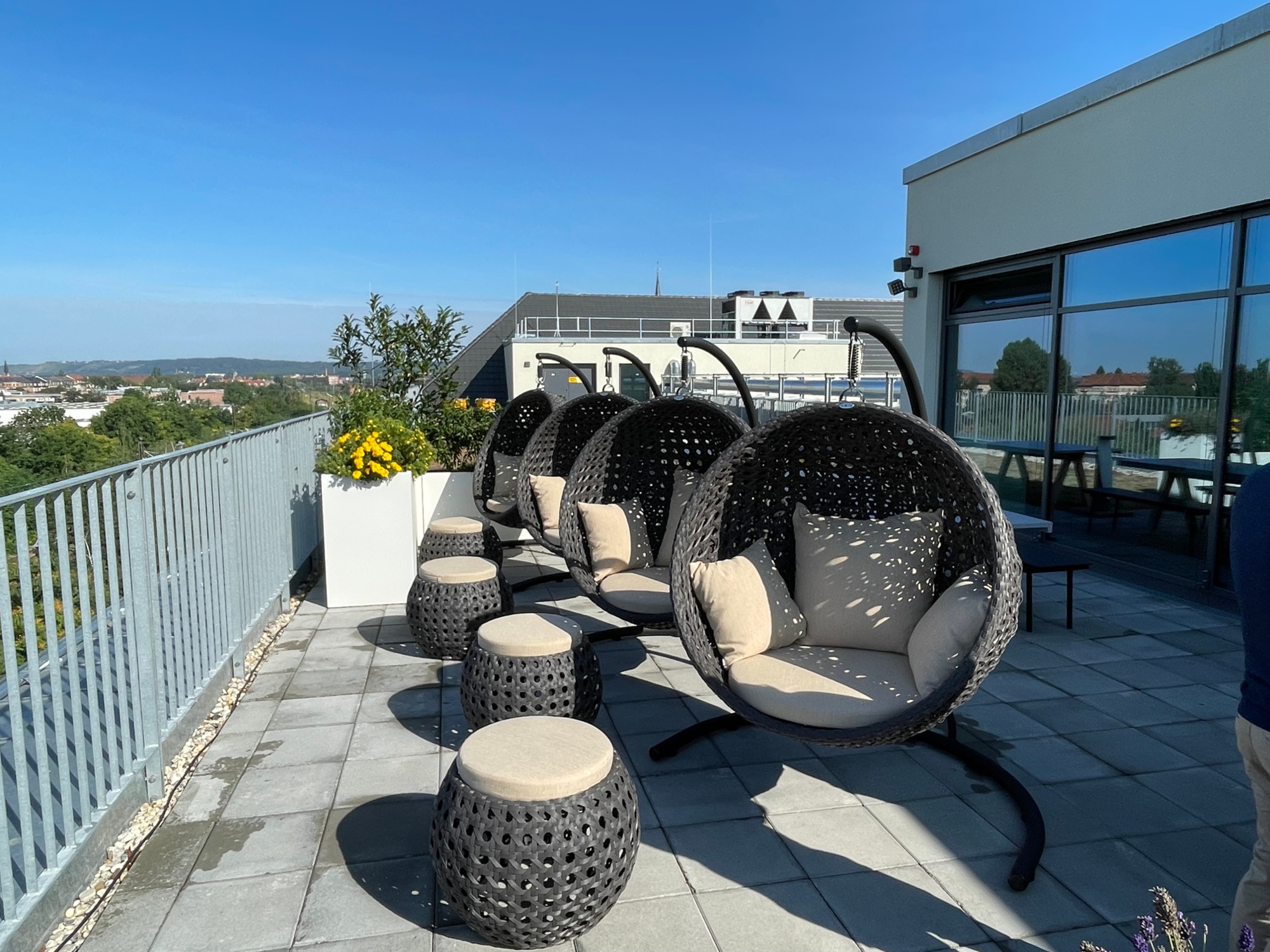 In den großzügig eingerichteten Büros befinden sich moderne Arbeitsplätze mit höhenverstellbaren Schreibtischen, Scrum-Räume für die produktive Zusammenarbeit (Scrum ist eine besondere Form des Projektmanagements bei der Softwareentwicklung), ein Stillraum für Mütter, ein Games Room für entspannte Pausen, große Küchen und eine Dachterrasse mit Wintergarten. Im begrünten Teil des Daches stehen Bienen-Stöcke. In der kommenden Woche wird hier ein drittes Bienenvolk einziehen, berichtete Sebastian Habel, der die Kooperation von Amazon mit dem deutschlandweiten Netzwerk „Bee Rent“ betreut. Rund 150.000 Bienen können dann rings um den Standort ausschwärmen. Das nahe gelegene Areal am Alten Leipziger sei mitten in der Stadt ein idealer grüner Standort. Der Imker aus Niedersedlitz verarbeitet den Honig, der dann den Amazon-Mitarbeiterinnen und Mitarbeitern zugute kommt. Dresden sei nach München der zweite Kooperationsstandort mit Bee Rent. Weitere sollen folgen.