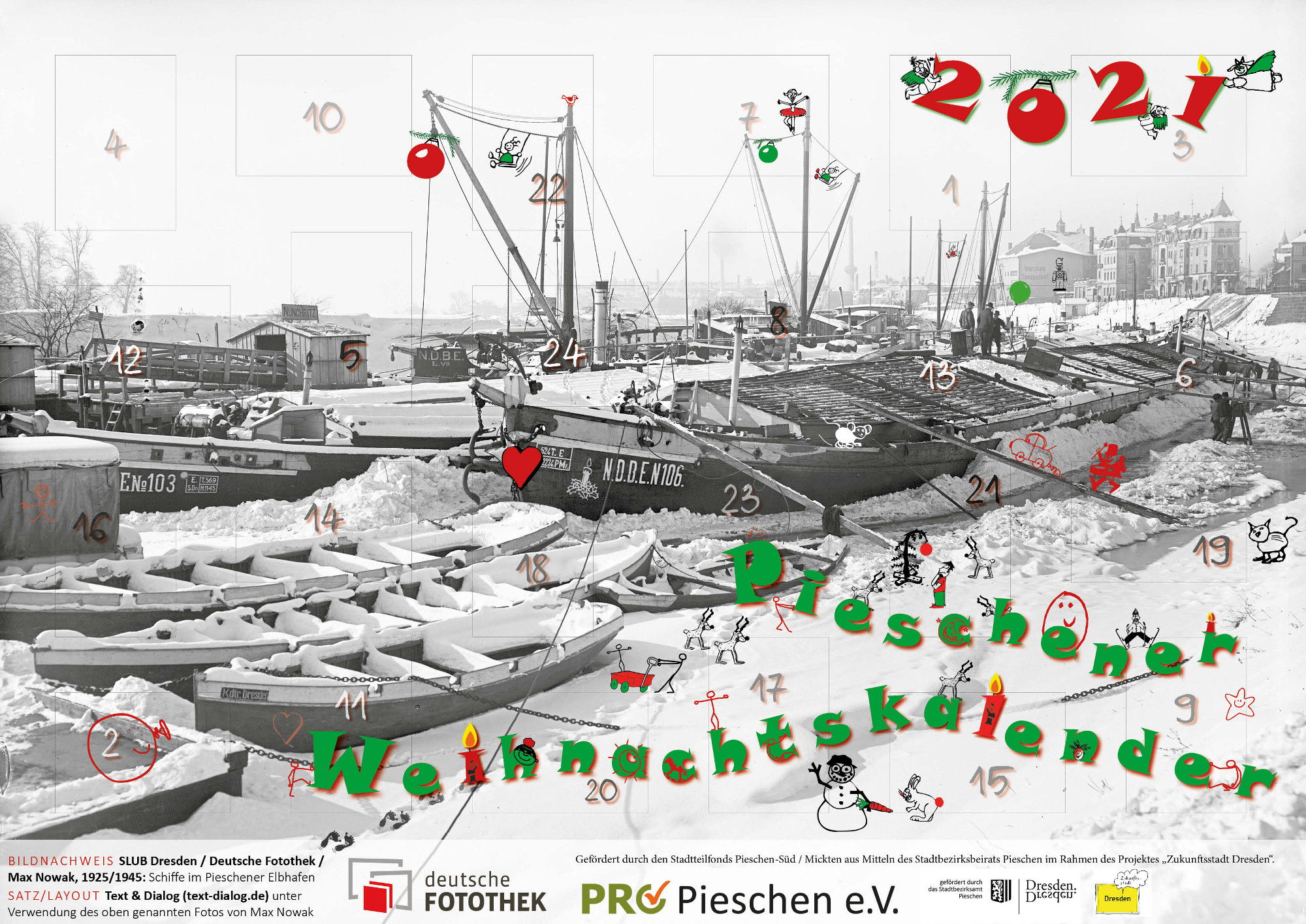 Um den Adventskalender in der Bibo Pieschen hatte sich Stadtteilhistoriker Jürgen Naumann einige Jahre lang verdient gemacht, dann war die Tradition jedoch eingeschlafen. Jetzt wurde sie mit Unterstützung des Stadtteilfonds Pieschen Süd / Mickten im Rahmen des von Friedrich Hausen und René Kaufmann betreuten Projektes „Heimat und Erinnerung“ wiederbelebt. „Wir hoffen, der Kalender findet Gefallen bei den Kindern. Wir wünschen allen Stadtteil-Bewohnerinnen und Bewohnern viel Freude damit und einen friedlichen Advent(us)“, sagte Kaufmann.
