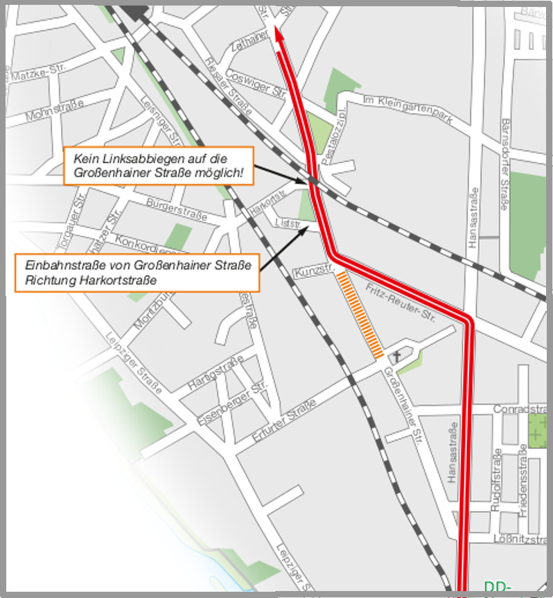Auch die Umleitung wurde geändert. Autofahrer sollten zwischen Bahnhof Neustadt und Trachenberger Platz oder Wilder Mann die ausgeschilderte Umleitung über die Hansastraße und die Fritz-Reuter-Straße benutzen. Der bisherige auch als Umleitung genutzte Fahrtweg ab Großenhainer Platz über die Erfurter Straße, die Gehestraße, die Harkortstraße in die Großenhainer Straße ist ab Montag nicht mehr nutzbar – eben, weil hier das Linksabbiegen nicht mehr möglich ist.