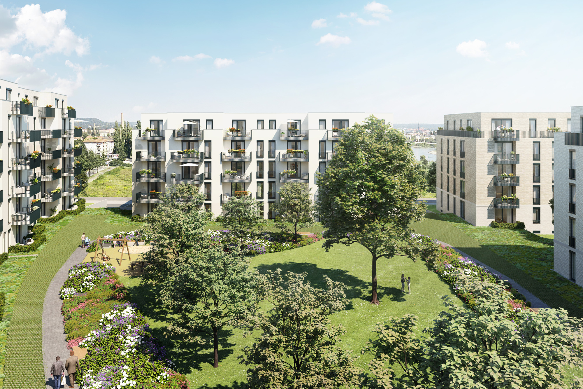 Die Fassaden der Wohngebäude sind aufwändig mit Riemchenklinker gestaltet. Die Innenhöfe sollen parkähnlich angelegt werden. Aufzüge und barrierefreie Wohnungszugänge von der Tiefgarage aus gehören ebenfalls zur Ausstattung wie mindestens ein Balkon oder ein Terrasse je Wohnung. Die größeren Wohnungen verfügen zudem über ein Gäste-WC. Elektrische Markisen, Fußbodenheizung, bodentief geflieste Duschen sind ebenfalls vorgesehen. Abstellplätze für Fahrräder und Kinderwagen gibt es in der Tiefgarage.