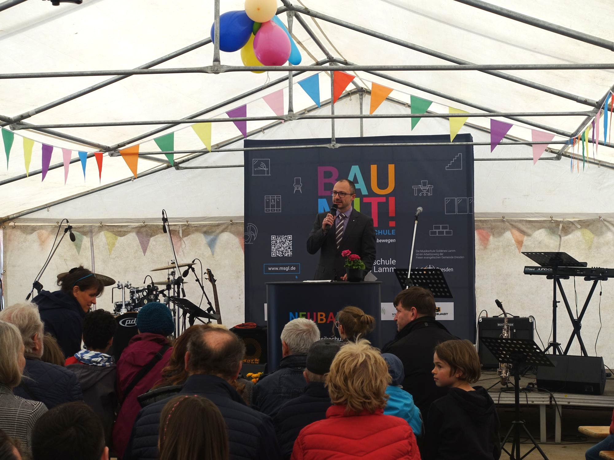 „Ich habe wirklich Feuer gefangen“, erinnerte sich Barbara Klepsch an ihre ersten Begegnung mit dem Team der Musikschule und dessen Arbeit. Die Ministerin für Kultur und Tourismus ist CDU-Landtagsabgeordnete für den Wahlkreis, in dem auch der Stadtbezirk Pieschen liegt. „Musizieren gehört zu den Grundpfeilern kultureller Bildung für Kinder und Jugendliche, aber auch für Erwachsene. Das Erlernen eines Instrumentes schult nicht nur musikalische Fähigkeiten; es stärkt das Selbstvertrauen der Schülerinnen und Schüler und trägt zur Persönlichkeitsbildung bei. Musizieren in der Gruppe vermittelt soziale Kompetenzen; es entsteht ein Gemeinschaftsgefühl, dass von Toleranz und Wertschätzung getragen wird“, sagte Klepsch in ihrem Grußwort und war sich darin einig mit Hartmut Hühnerbein, Vorstandsvorsitzender der „Stiftung für christliche Wertebildung (Wertestarter)“ aus Berlin und Haiger, die das Bauvorhaben von Anfang an unterstützt. „Ich sehe die Musikschule vor allem als Lebensschule. Das Dach, das wir jetzt setzen, soll sich als schützend und bewahrend auch über die Zukunft der Schülerinnen und Schüler legen“, so Hühnerbein. Klepsch und Hühnerbein lösten dann ihr zur Grundsteinlegung gegebenes Versprechen ein und luden zu Essen und Trinken am Grill.