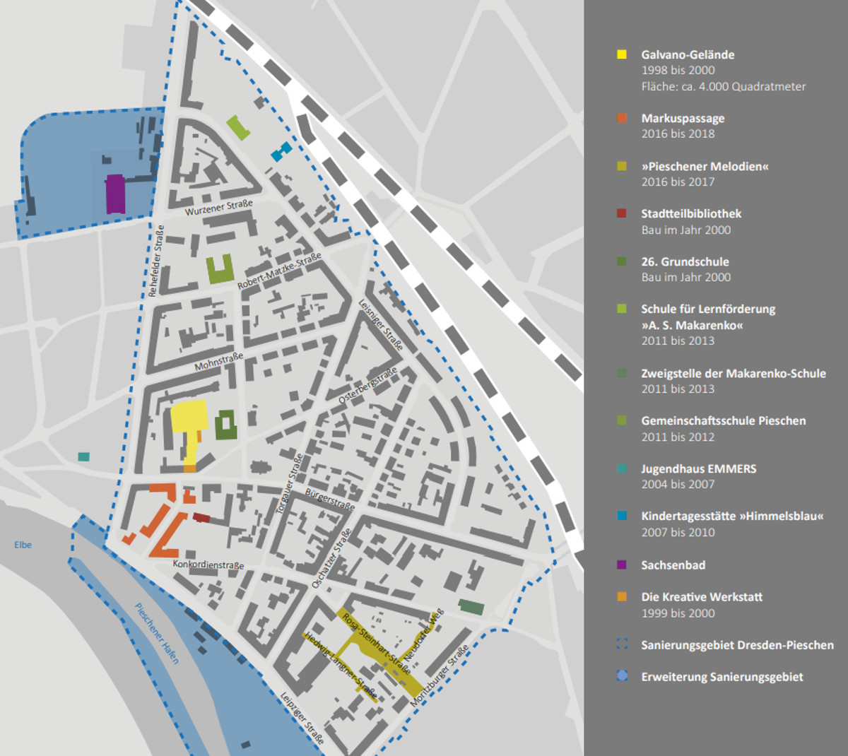 Für Stefan Szuggat, Leiter des Stadtplanungsamtes, ist die Entwicklung Pieschens in den vergangenen 30 Jahren eine „außergewöhnliche Geschichte“. Der vergleichsweise schlechte Ruf und der katastrophale Bauzustand der Wohnhäuser seien Geschichte. Die besondere Sozialstruktur konnte, auch dank des Bestandes an kommunalen Wohnungen, erhalten werden. Fördergelder flossen auch in die Schulstandorte. So konnten mit Geldern aus der Städtebauförderung benachbarte Grundstücke für Schulerweiterungen am Standort Makarenko-Schule und der Gemeinschaftsschule Pieschen erworben werden. Das Kinder- und Jugendhaus Emmers wurde mit rund einer Million Euro saniert.