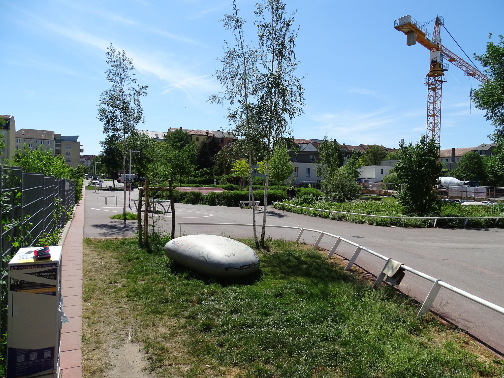 Im Innenhof sind ein Spielplatz, Grünflächen und ein Freifläche mit Sonnensegel entstanden. „Der Platz ist beliebt für Bildhauerkurse und Kunstaktionen“, erklärte