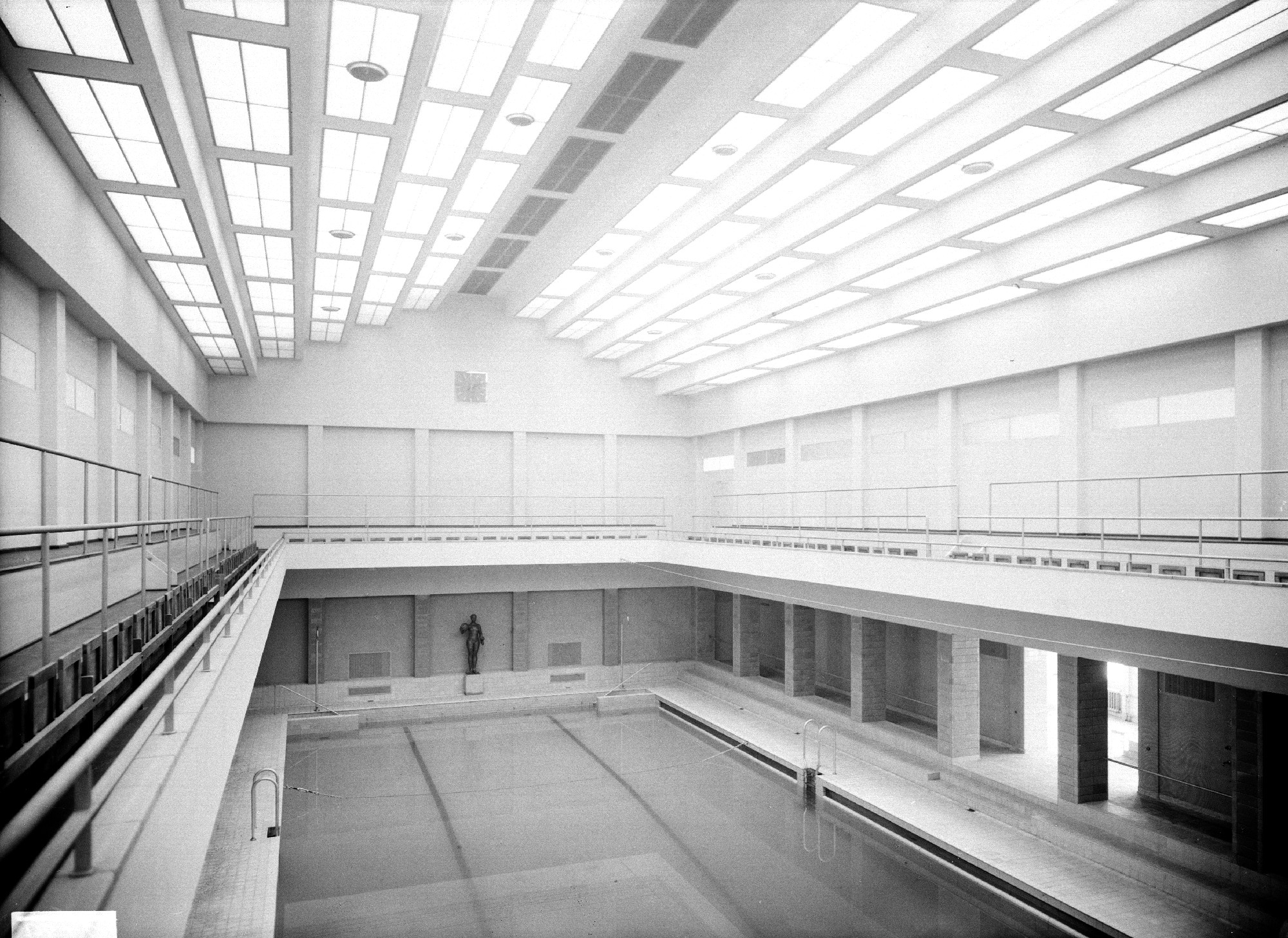 Schwimmhalle des Sachsenbades mit der Skulptur „Ballspielerin“, 1929. Quelle: Stadtarchiv Dresden, 6.4.40 Stadtplanungsamt Bildstelle, Nr. II7241, unbekannter Fotograf, 1929