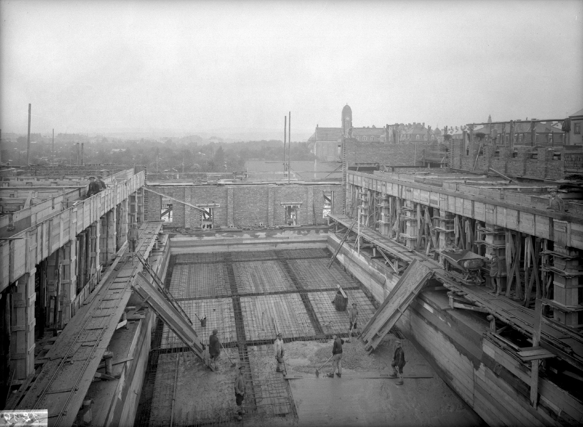 Auf der Sachsenbad-Baustelle – Bauzustand im Mai 1928. Quelle: Stadtarchiv Dresden, 6.4.40 Stadtplanungsamt Bildstelle, Nr. II7181_2, unbekannter Fotograf, 1928