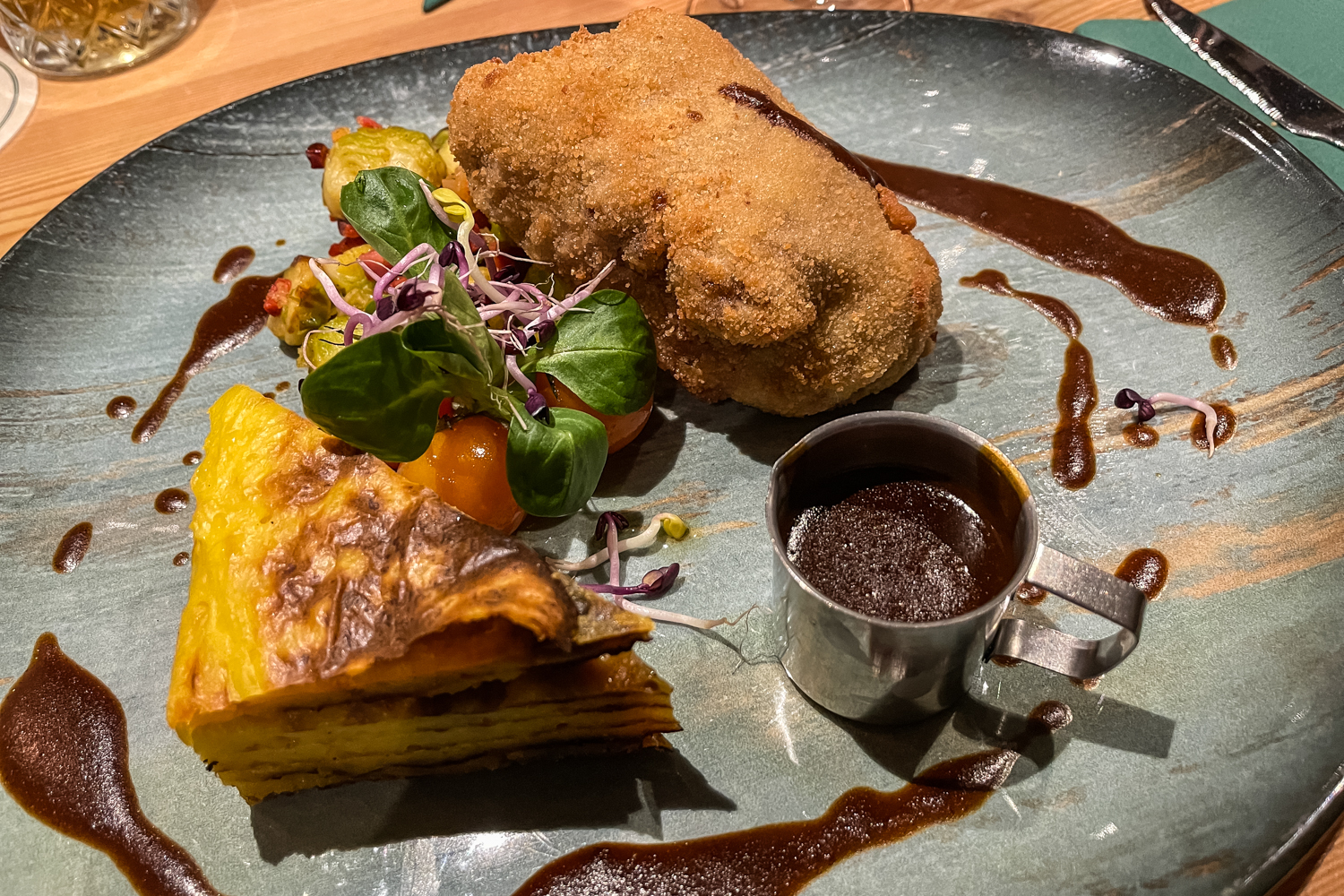 Die Roastbeefroulade war (um das Fleisch vor den Veganern zu verstecken?) in einer Kruste versteckt, was gut würzig schmeckte und einen zusätzlichen Hauch von Umami ergab, aber eben auch ziemlich ins Sättigungskontor schlug (wenn das schräge Bild mal erlaubt sei). Prima: Es gab extra Sauce. Noch mehr prima: der Chorizo-Rosenkohl. Die Kalorienbombe Kartoffel-Safran-Baumkuchen stufte ich als typisch deutsche Sättigungsbeilage ein, ergo: überflüssig. Aber das ist, wie alles, natürlich streng subjetive Geschmackssache.