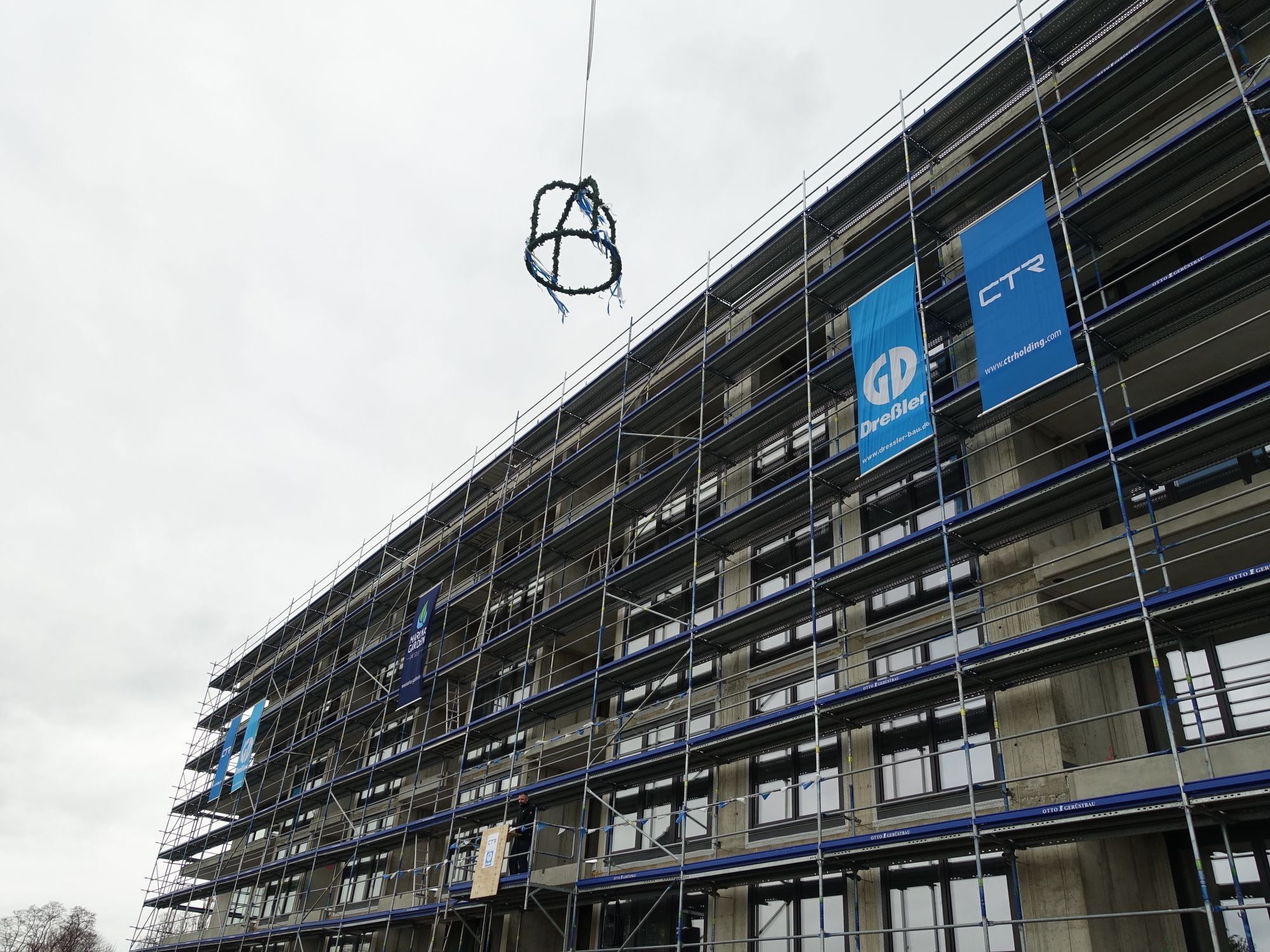 Wir haben ein Zeichen gesetzt, wie man auch in diesen Zeiten effektiv bauen kann“, sagte Steffen Herzer heute beim Richtfest für das Projekt Marina Garden. Mit „wir“ meint der Oberbauleiter die Firma Dreßler als Generalauftragnehmer und den Bauherren, die tschechische Unternehmensgruppe CTR. Wenig später wurden nach dem Richtspruch die obligatorischen Nägel eingeschlagen. Dann schwebte die Richtkrone unter dem Beifall der geladenen Gäste in den Himmel. Und dann war Zeit für Speisen und Getränke – inszeniert vom Team des Nachbarn Citybeach.